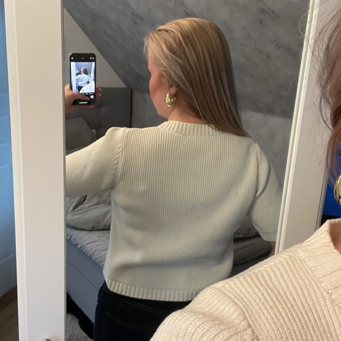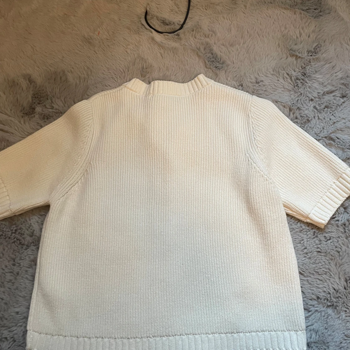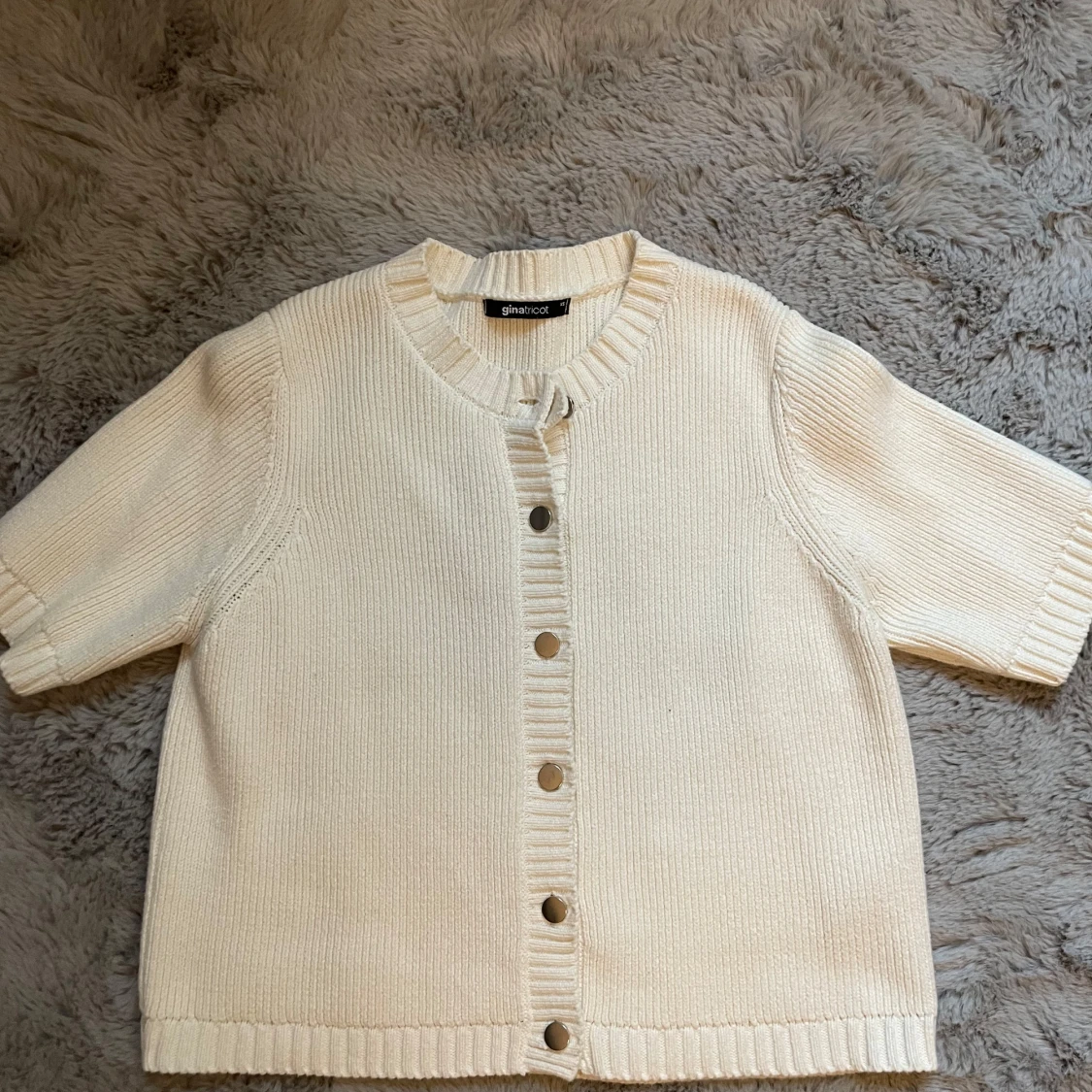 Säljer en vit ribbad topp från Gina Tricot med korta ärmar och rund hals. Toppen har knappar framtill och är stickad i ett mjukt material. Perfekt att styla med jeans eller kjol för en clean look.