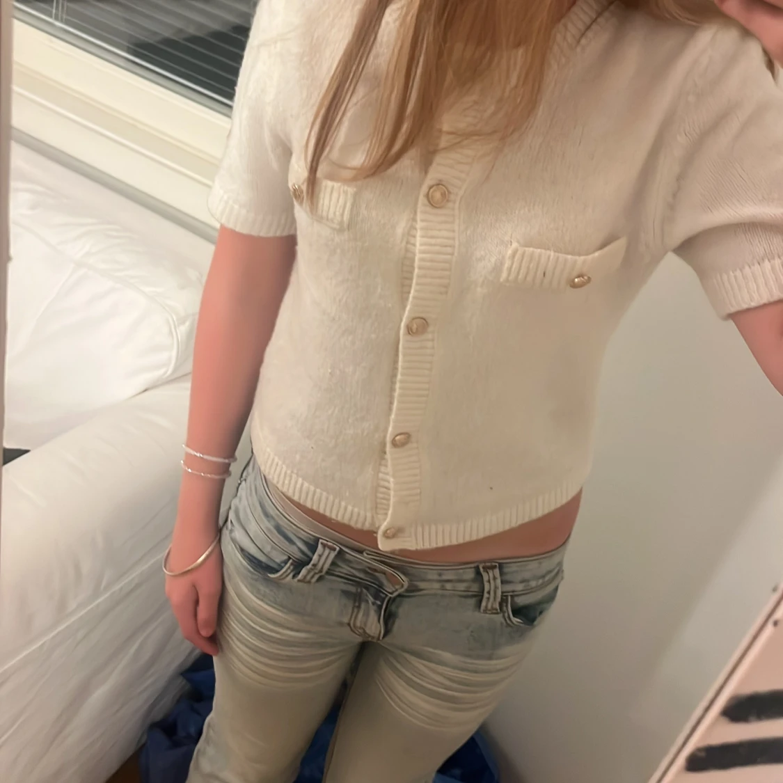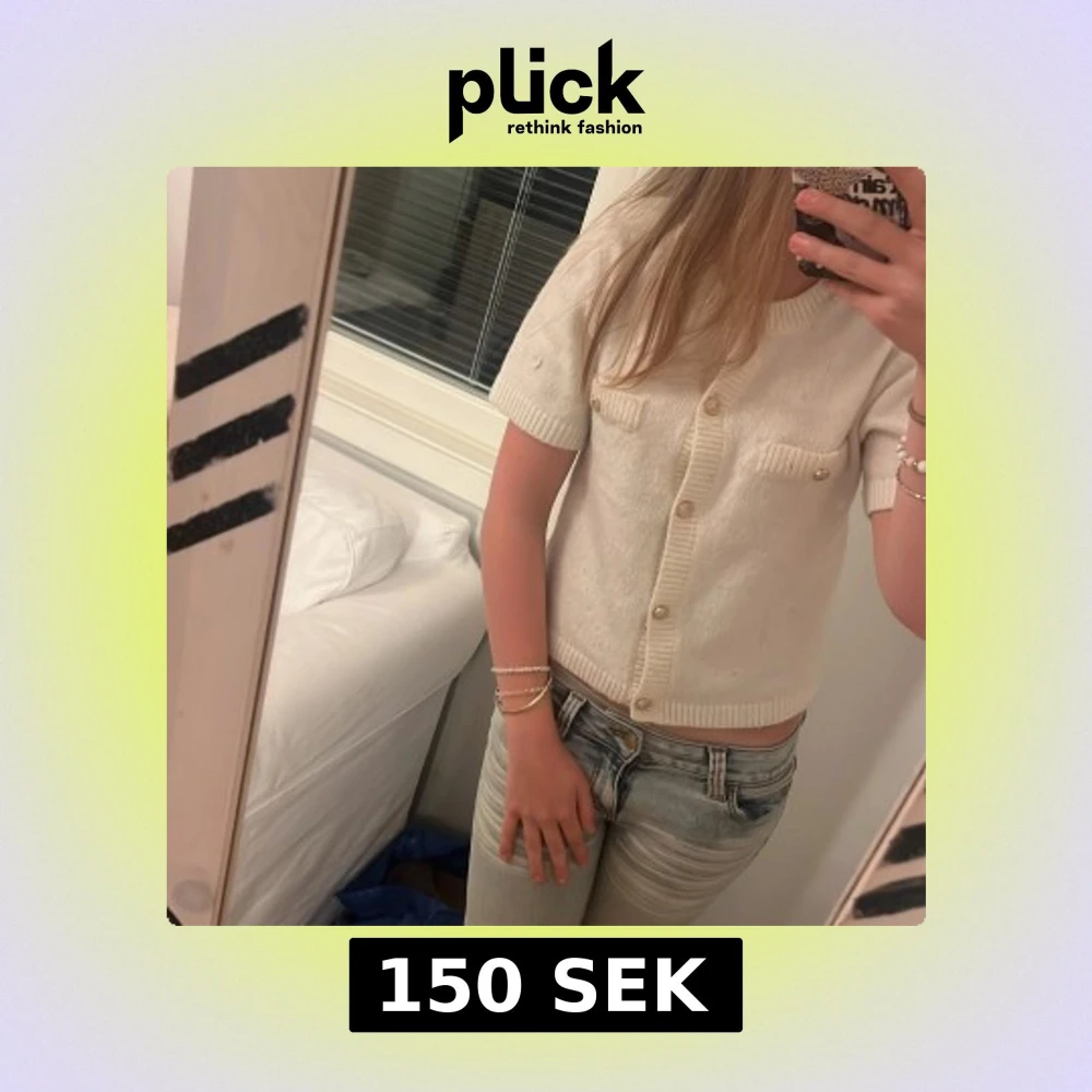 Supersöt vit stickad blus med korta ärmar och guldiga knappar framtill. Två fejkade bröstfickor med dekorativa knappar. Croppad modell med ribbade kanter och mjuk känsla. Perfekt för dig som gillar en clean och chic look.