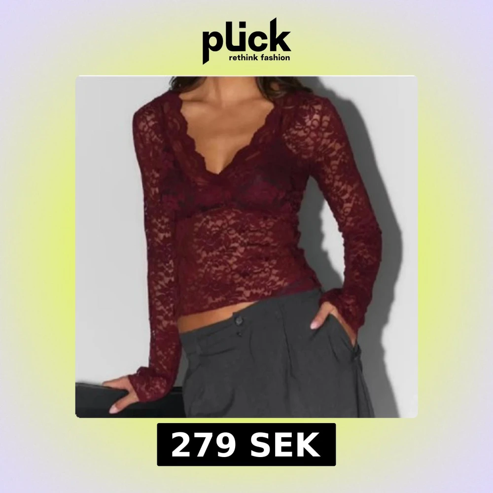 Säljer en elegant vinröd spetsblus från Gina Tricot. Blusen har långa ärmar och en v-ringad design som ger en feminin touch. Perfekt för inte bara vardag, men även en kväll ute eller en speciell tillställning🥰🥰