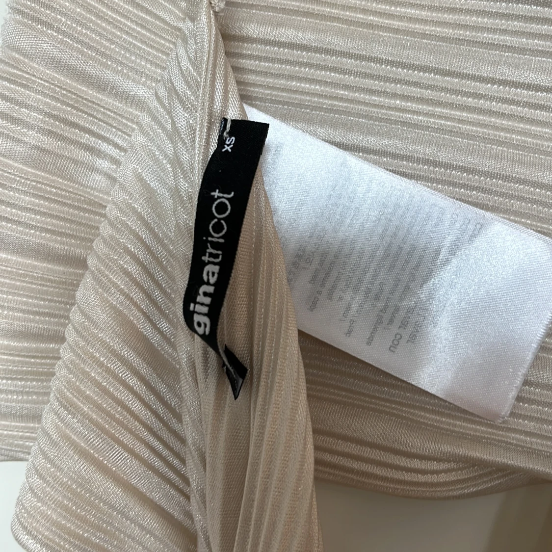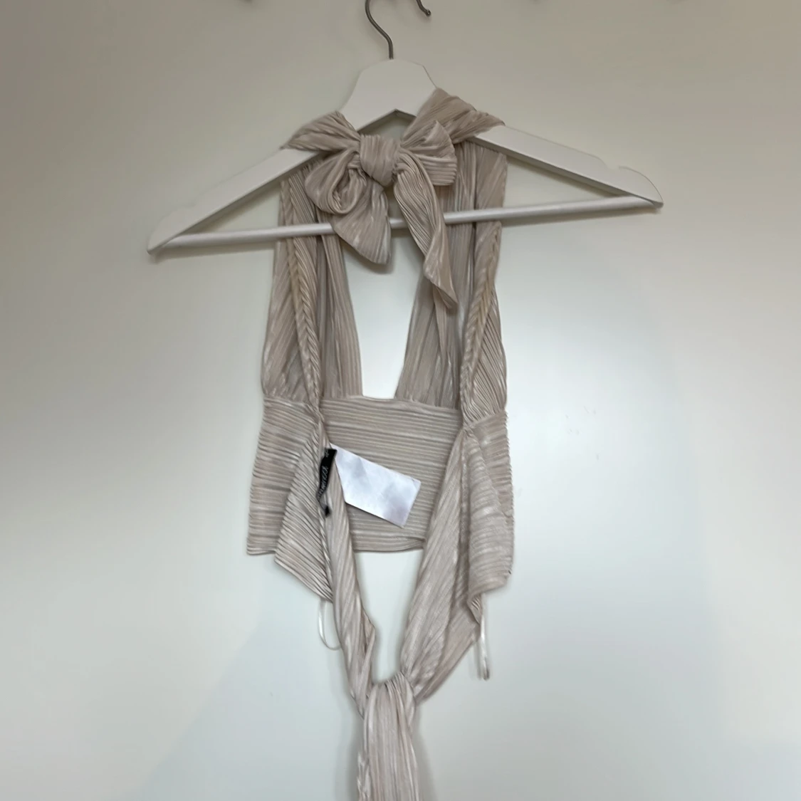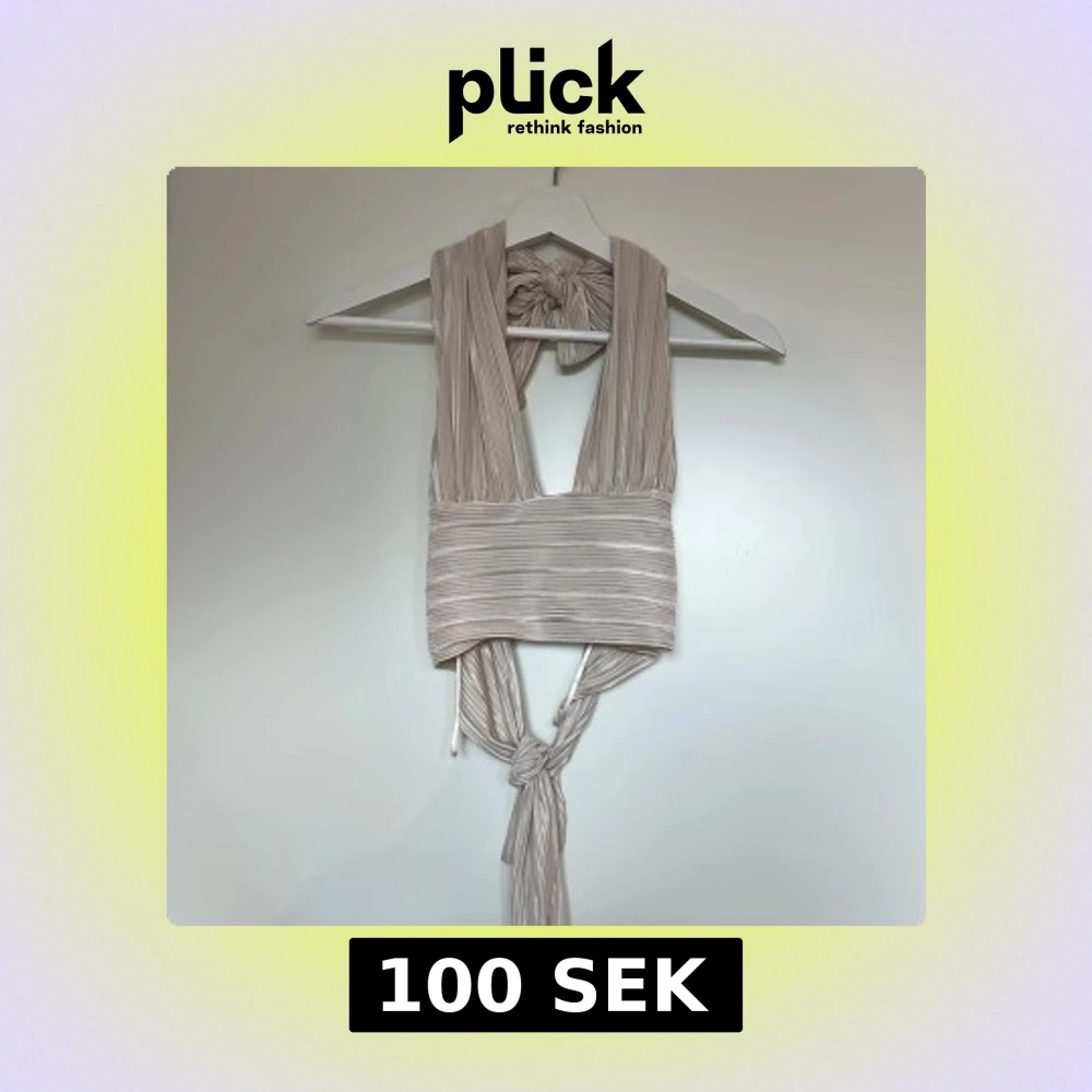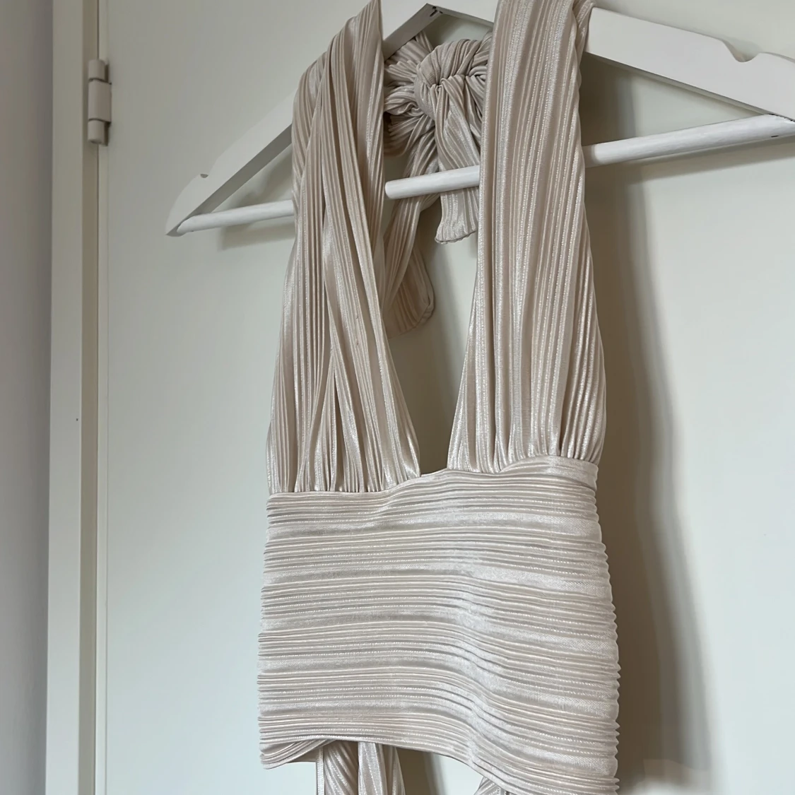 Supersnygg omlottopp i champagnefärgat glansigt tyg från Gina Tricot. Toppen har breda axelband, knyt i nacken och midjan samt plisserad struktur.