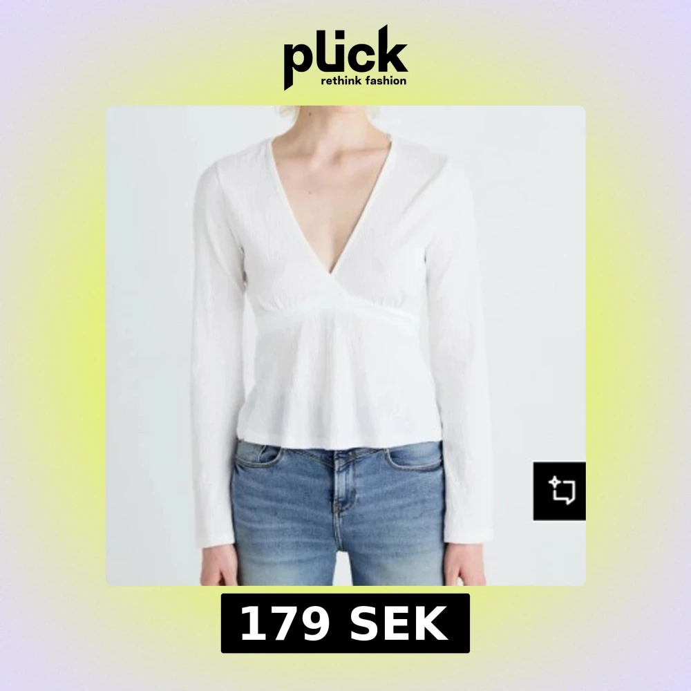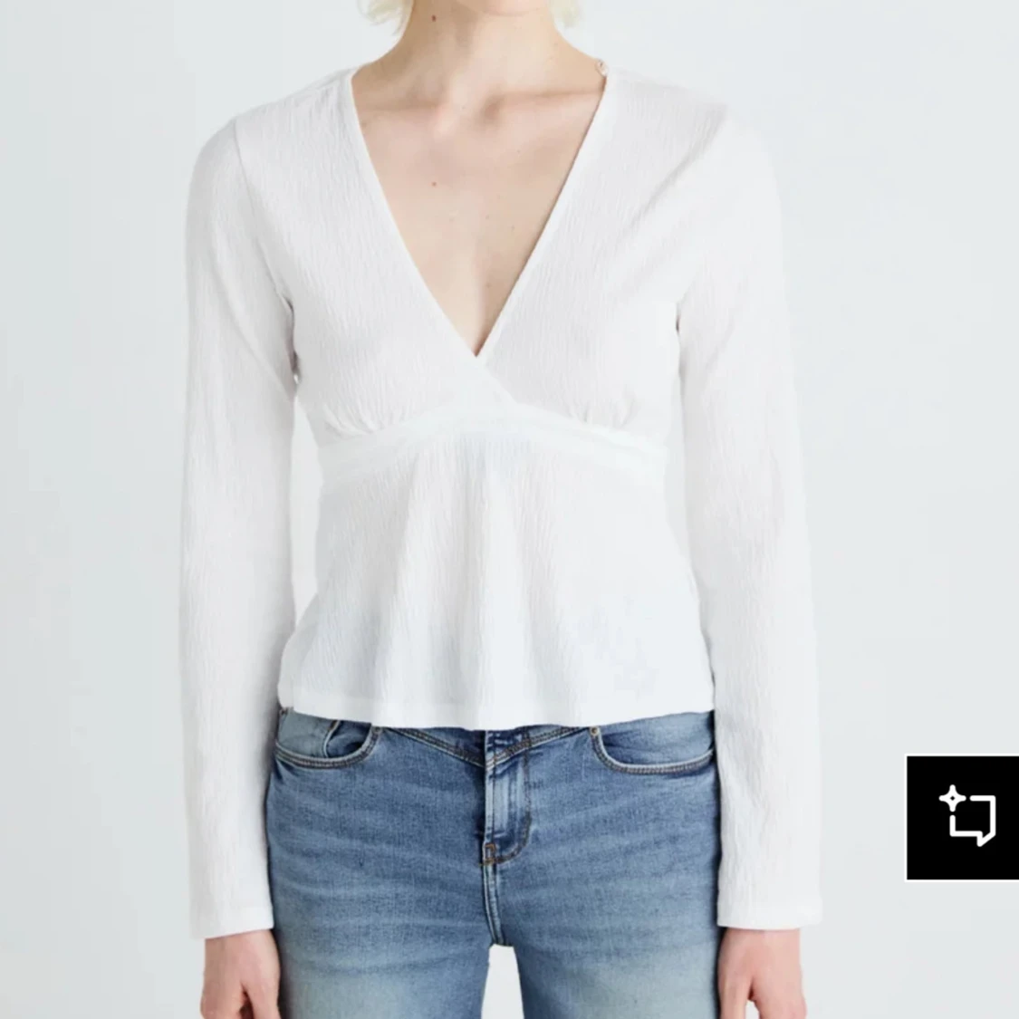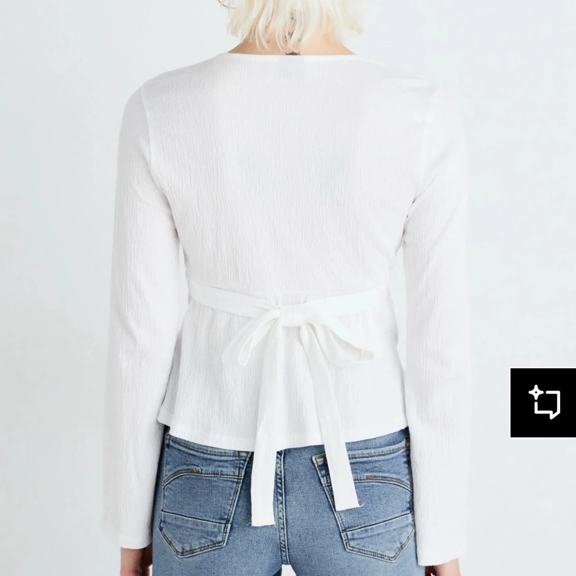 Vit omlottopp med v-ringning och långa ärmar. Toppen har en lätt strukturerad yta och knytband i ryggen som ger en extra detalj. Använd en gång till ett specifikt tillfälle utan några defekter.
