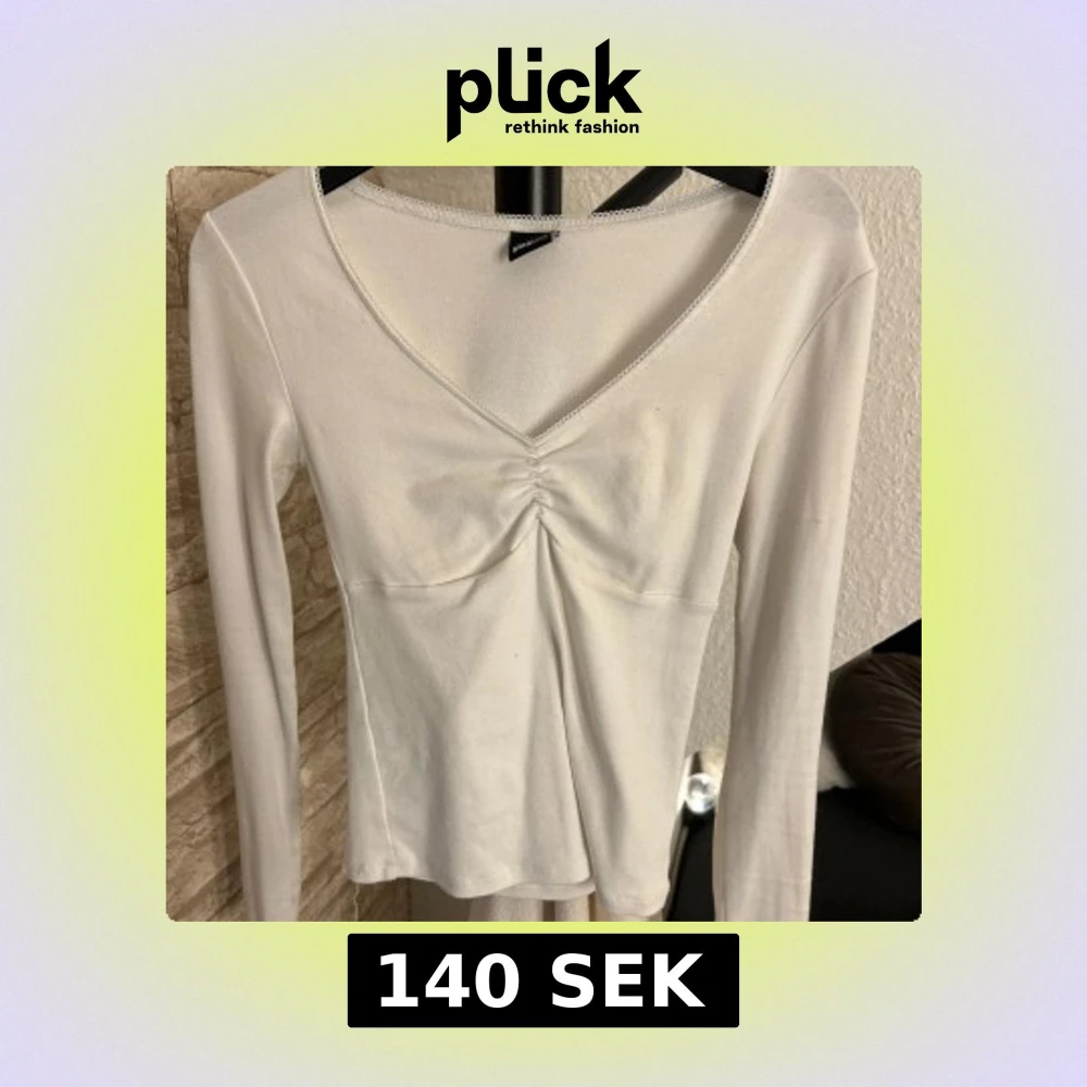 Snygg vit långärmad topp från Gina Tricot med v-ringning och rynkdetalj framtill. Mjuk och stretchig bomullskänsla, perfekt till jeans eller kjol.