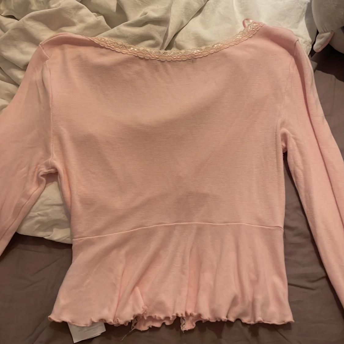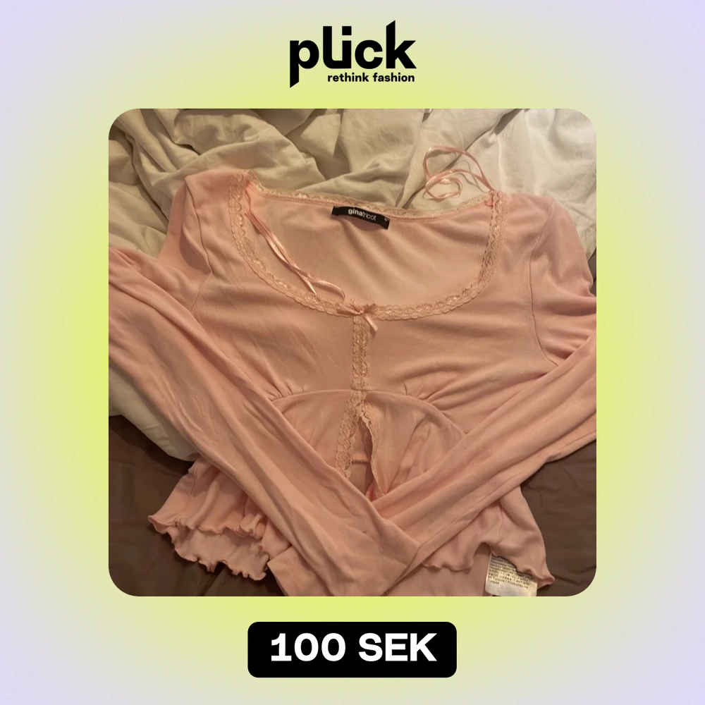 Säljer en söt rosa långärmad topp från Ginatricot. Toppen har spetsdetaljer runt halsringningen och en knytning framtill. Den är lätt och bekväm, perfekt för vår och sommar. Använd en gång, inga defekter. Pris kan diskuteras!