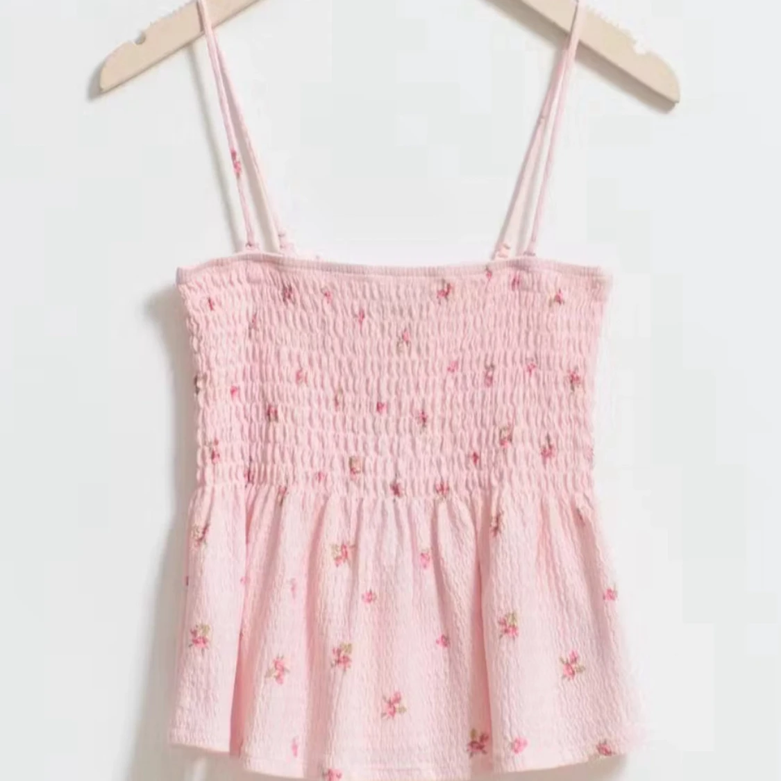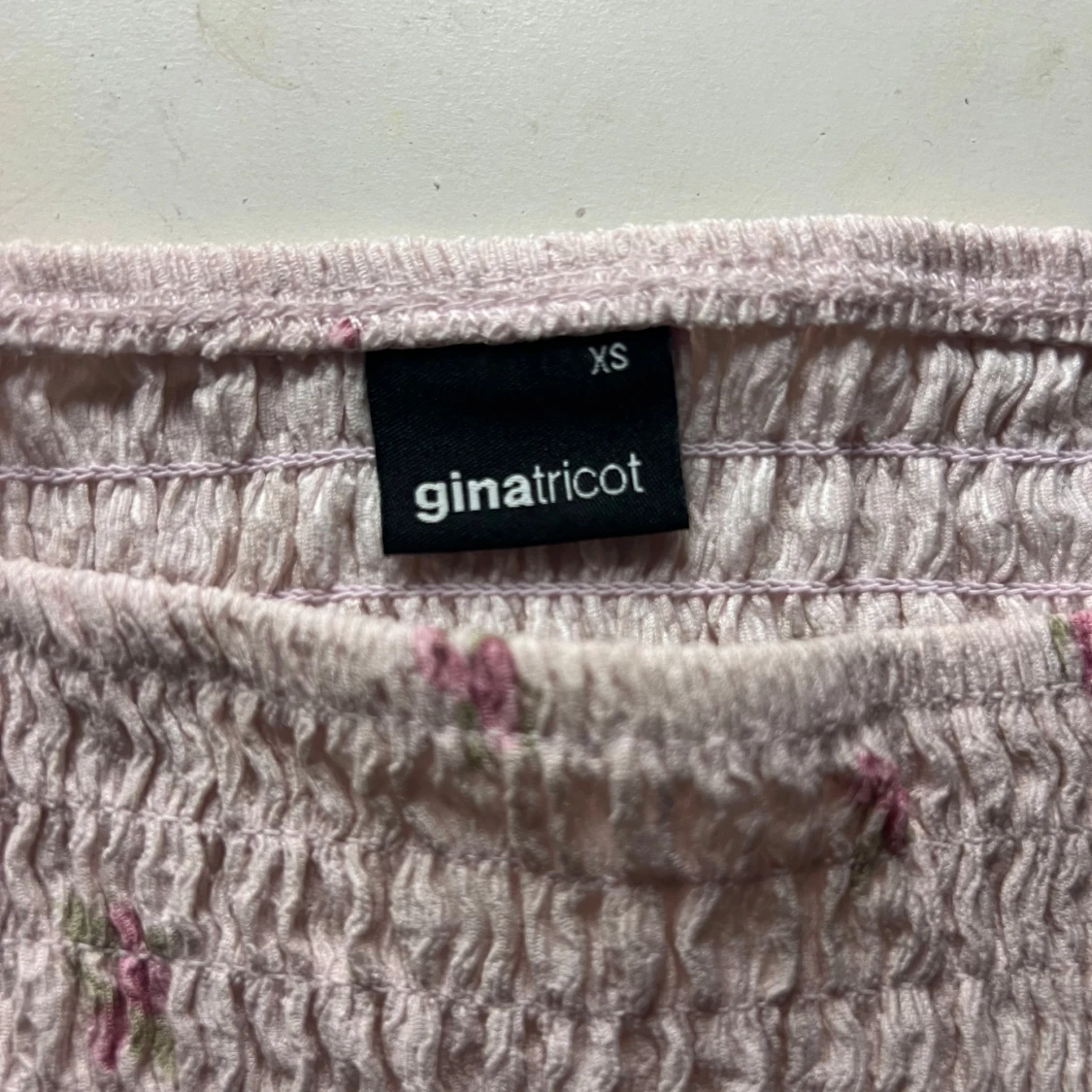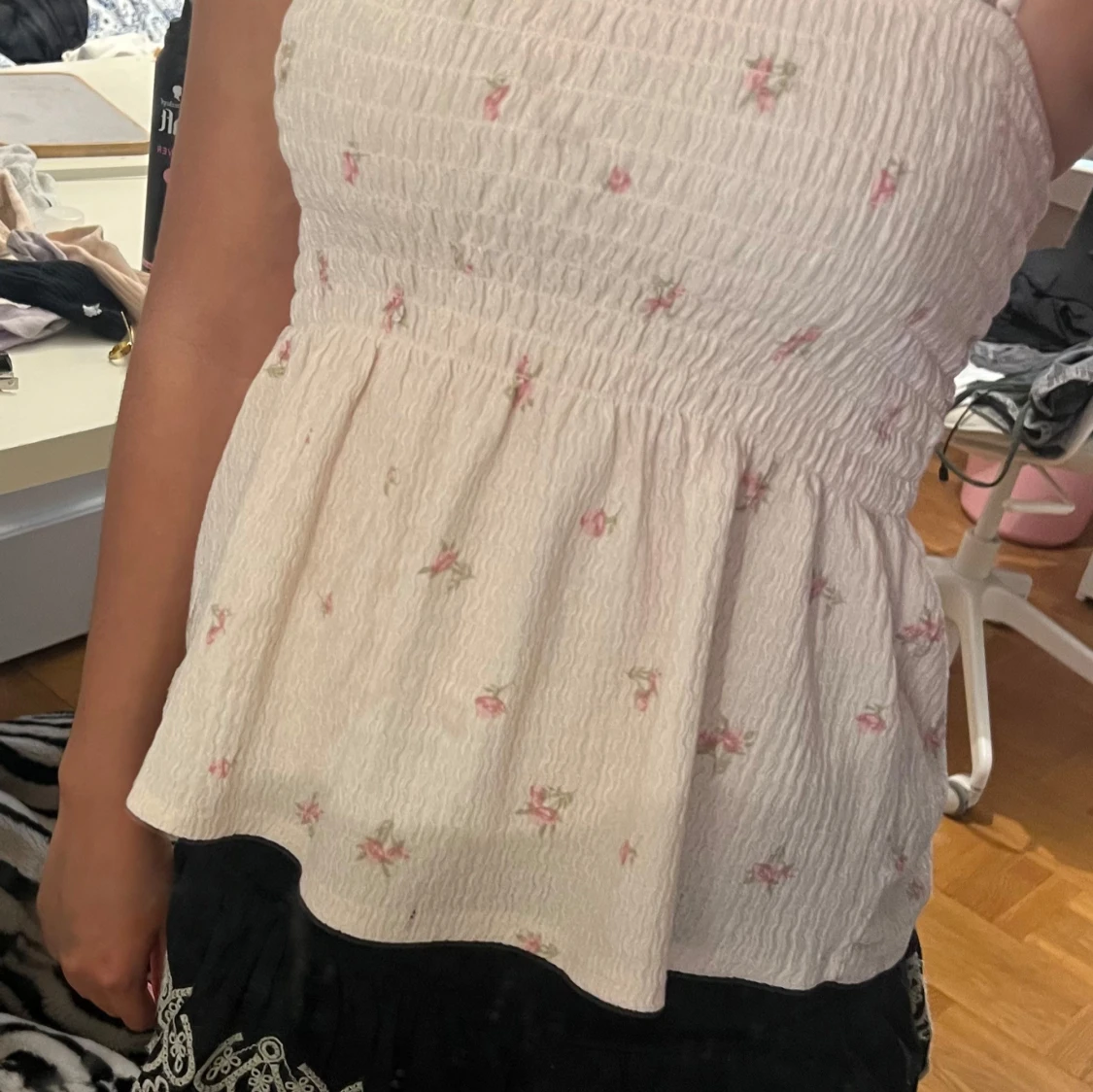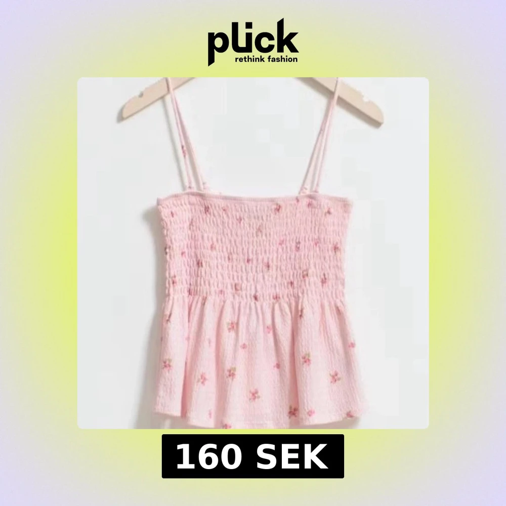 Supersöt rosa linnetopp från Gina Tricot med små blommor och smockad överdel. Tunt, luftigt tyg och smala axelband. Perfekt för varma dagar och ger en gullig vibe till outfiten.