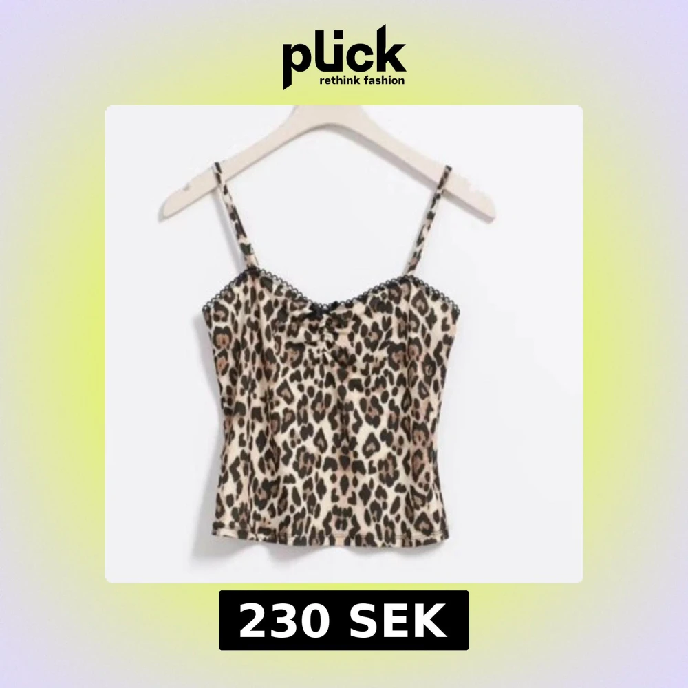 Säljer en snygg leopardmönstrad linnetopp med tunna axelband och svart spets längs urringningen. Toppen har en figurnära passform och är perfekt för att skapa en trendig look.