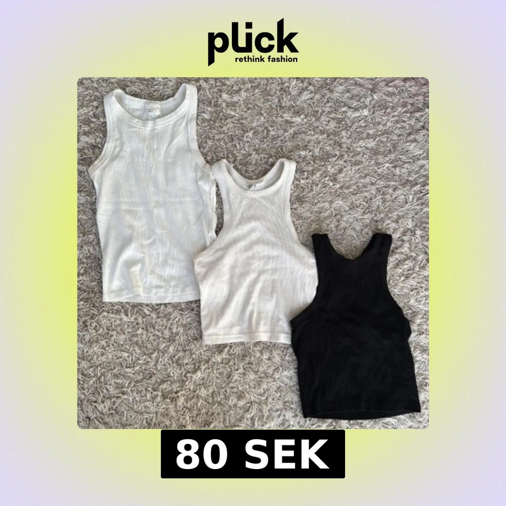 Säljer tre ribbade linnetoppar i två vita och en svart färg. Perfekta för en avslappnad stil och kan enkelt matchas med olika outfits. Storlek xs i varje! 80 kr/st. Det till vänster är från gina tricot. De två åt höger från hm