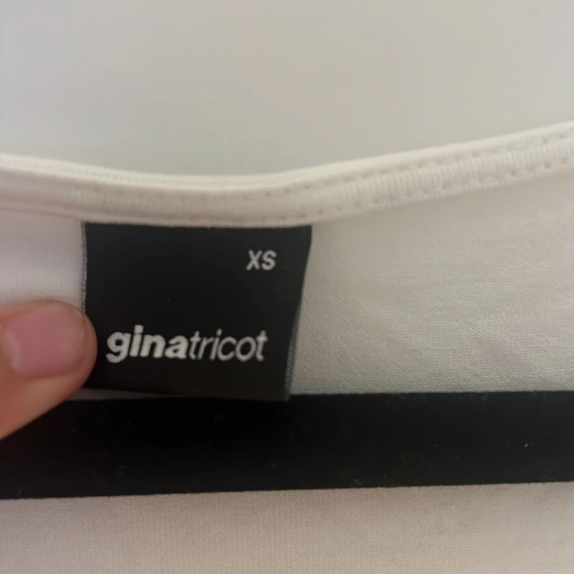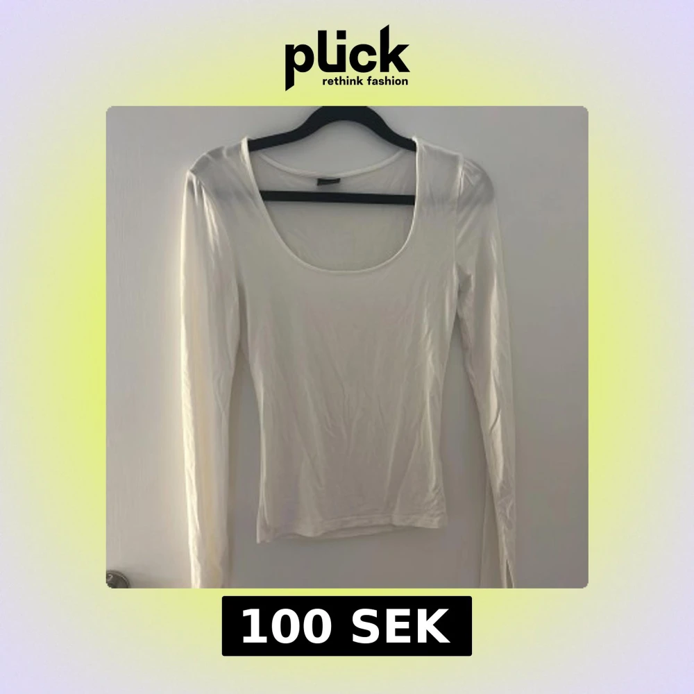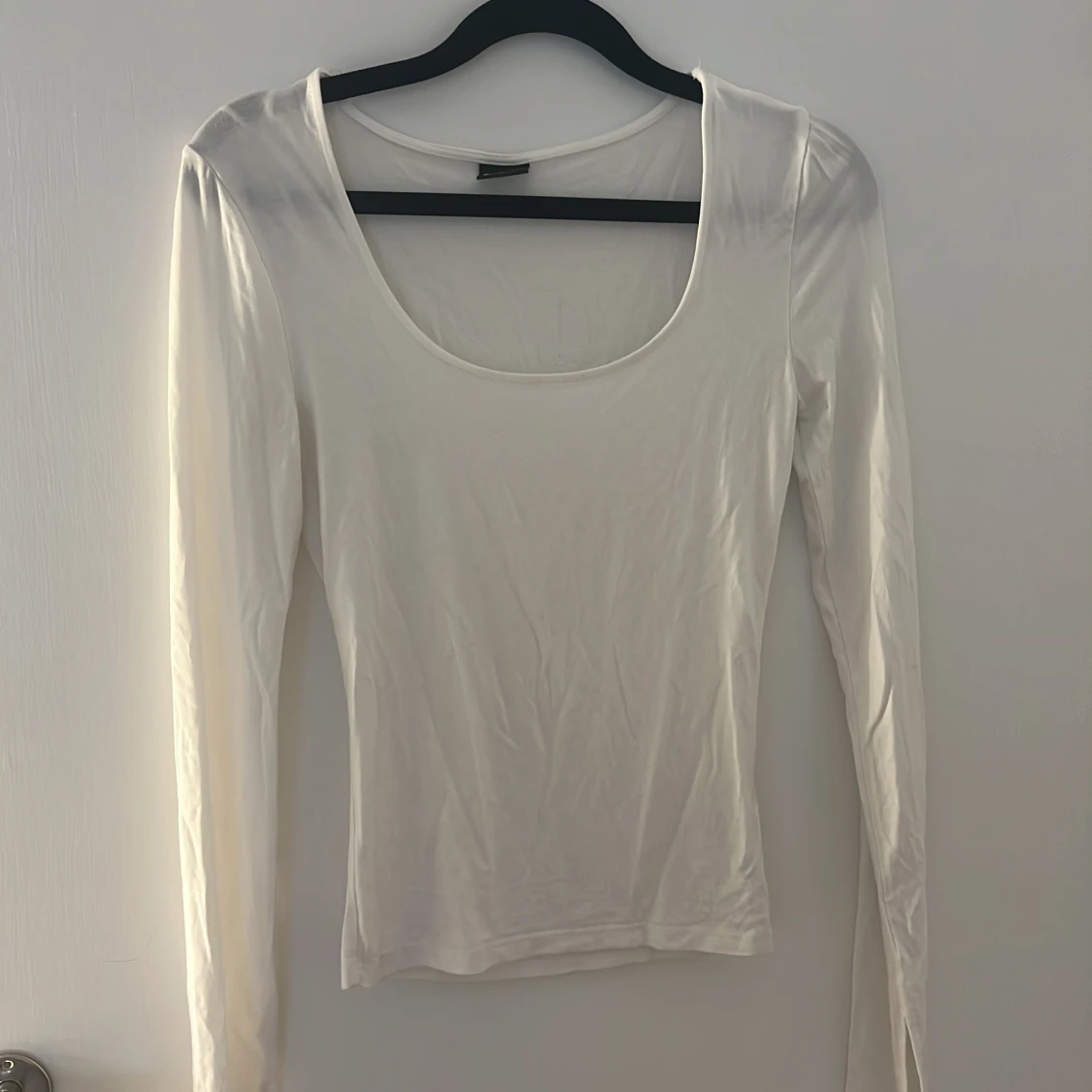 En stilren vit långärmad topp från Gina Tricot i storlek XS. Toppen har en djup rundad urringning och är figurnära i modellen. Perfekt att matcha med jeans eller kjol för en clean look.