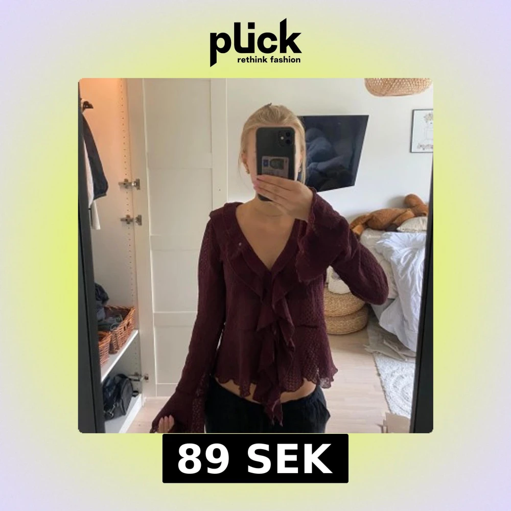 Supersöt vinröd blus från Gina Tricot med volangdetaljer längs v-ringningen och framtill. Lätt transparent material, långärmad med utsvängda ärmslut och croppad passform. Sällan använd