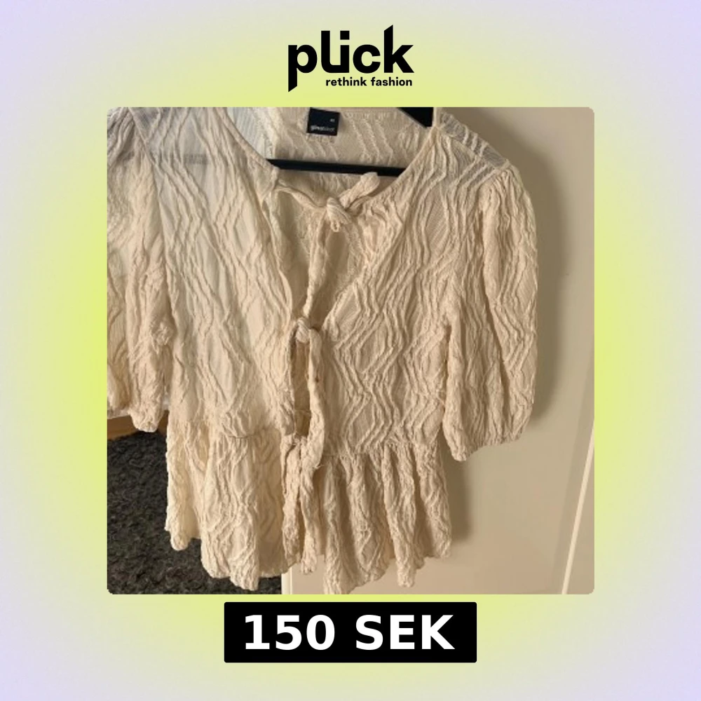Supersöt beige blus från Gina Tricot i storlek XS. Blusen har ett strukturerat tyg med vågigt mönster, korta puffärmar och två knyt framtill. Den har en luftig och flowy passform, perfekt för en chill och trendig look.