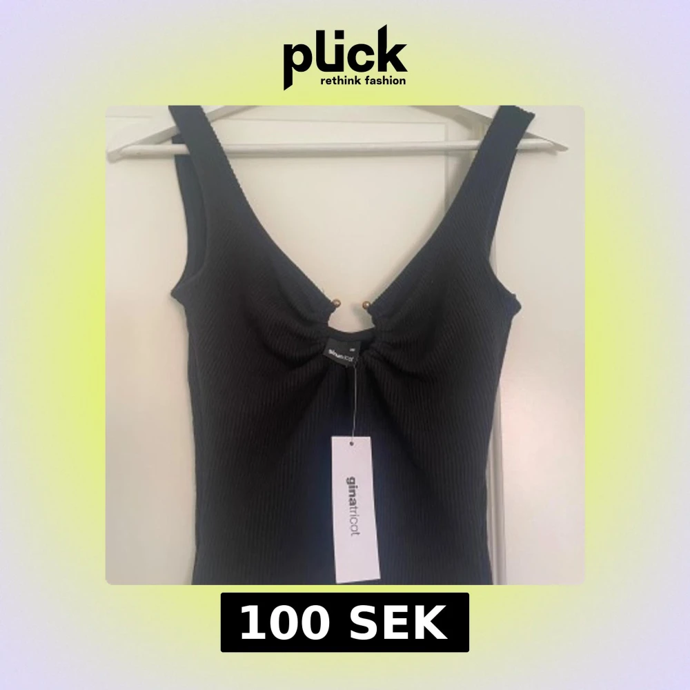 Svart ribbad linnetopp från Gina Tricot med djup v-ringning och snygg rynkdetalj framtill. Tjockare axelband och coola guldfärgade metalldetaljer vid urringningen. Perfekt att styla med jeans eller kjol.