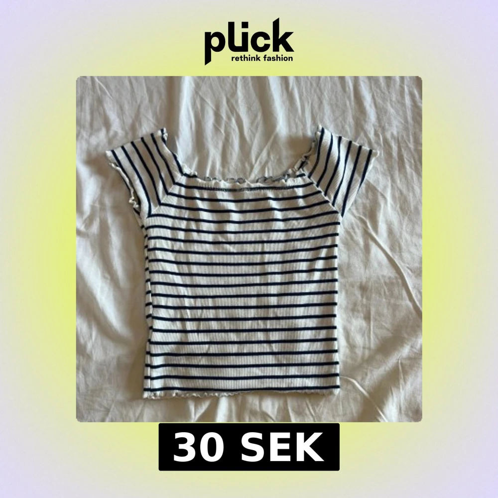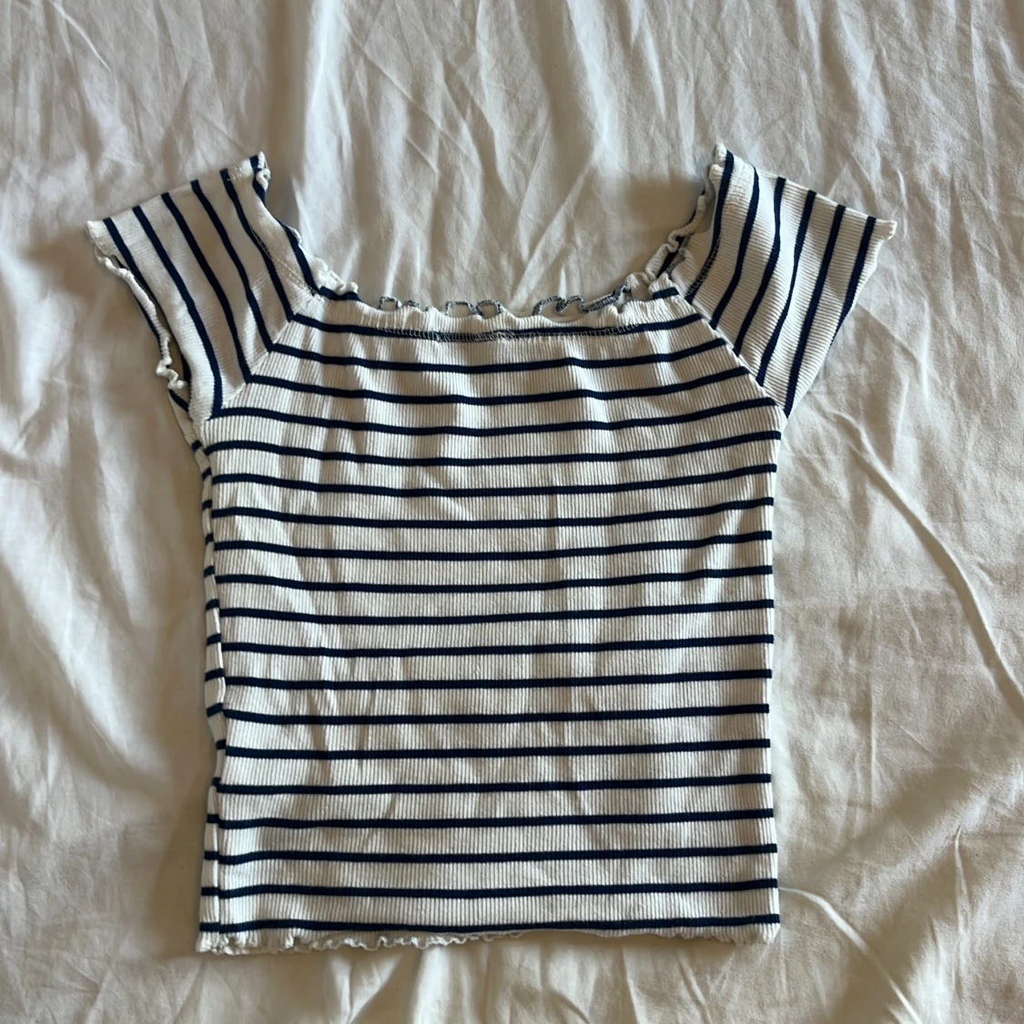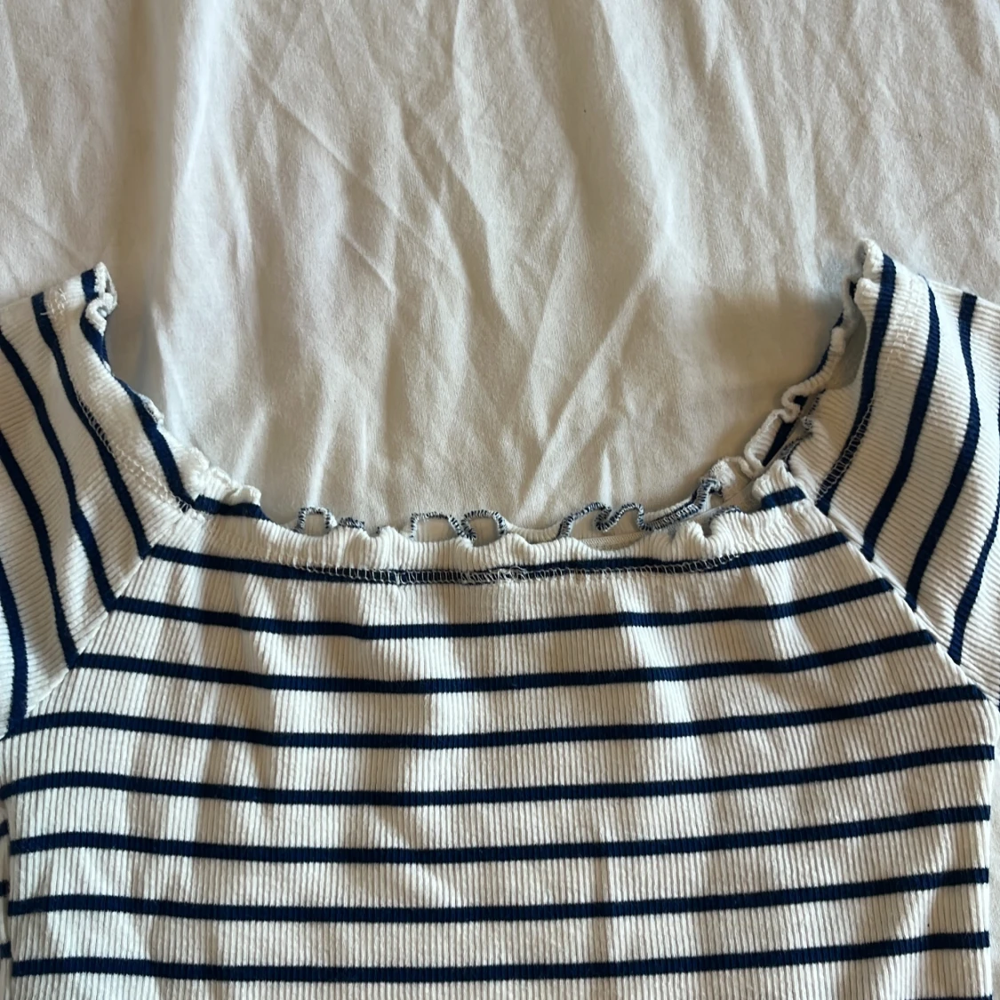 Superfin vit topp med marinblå ränder och ribbad struktur. Modellen är croppad med korta ärmar och har söt volangkant vid halsringning och nederkant. Perfekt för en chill sommarlook.