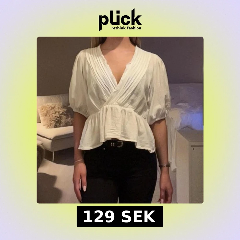 Säljer en vit blus med omlottdesign och djup v-ringning. Blusen har puffiga korta ärmar och ett volangformat avslut nedtill.