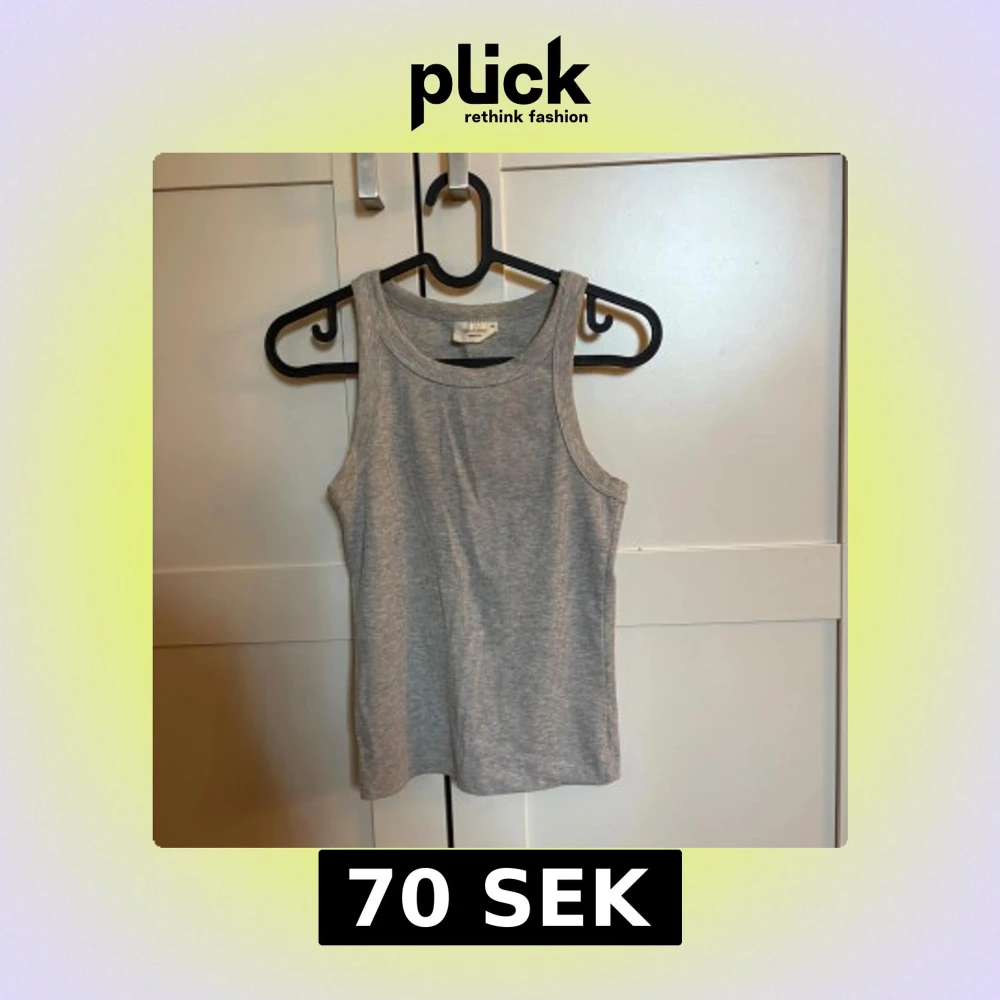 Säljer en enkel och stilren grå ribbad linnetopp från Gina tricot. Toppen är ärmlös med klassisk rund halsringning och har en tight passform.