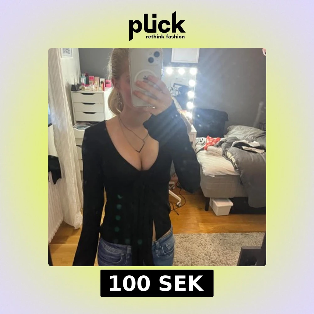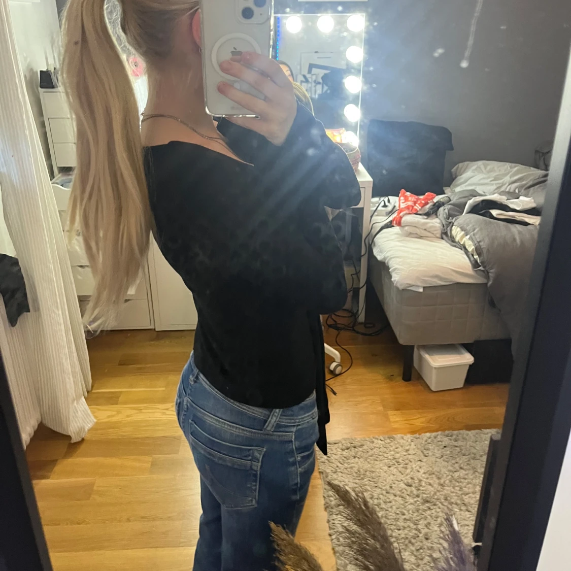 Säljer en svart omlottopp med lång ärm och djup v-ringning. Toppen har knyt framtill som ger en snygg detalj och sitter figurnära. Perfekt att styla med jeans eller kjol för en trendig look.