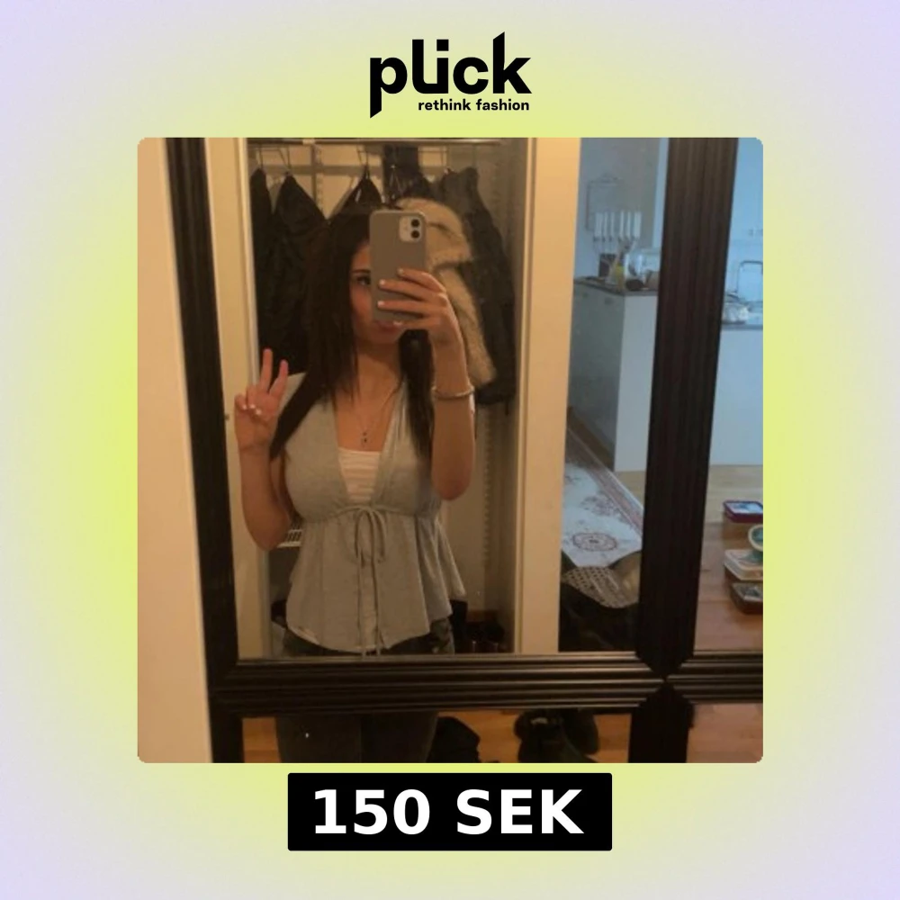 Säljer en stilren grå omlottopp med knytband i midjan. Toppen är i nyskick och ser helt ny ut