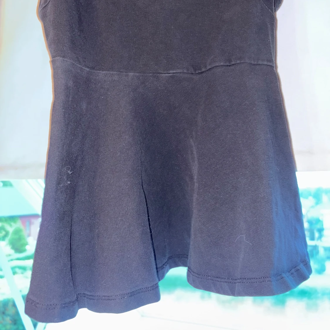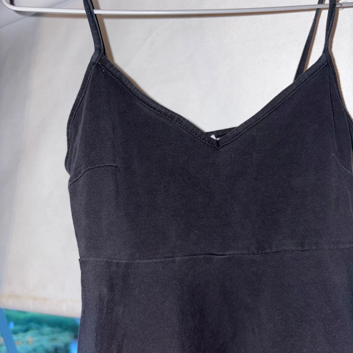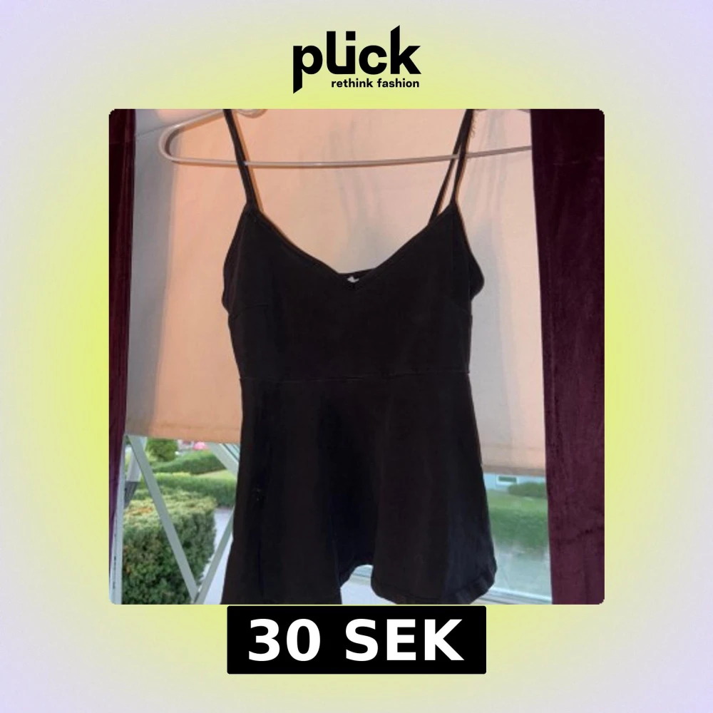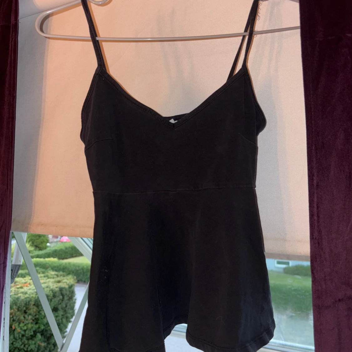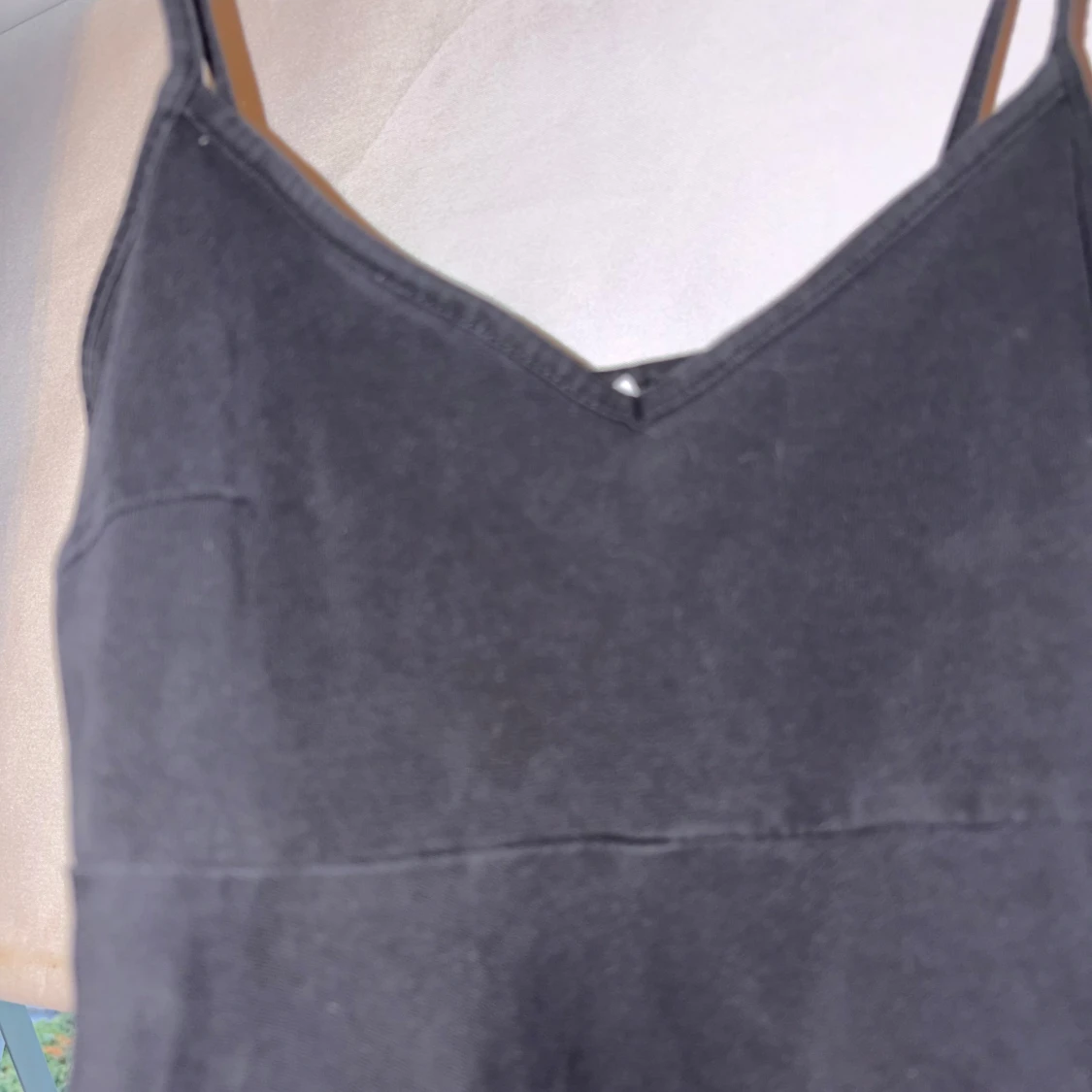Svart linnetopp med smala axelband och snygg v-ringning. Toppen har en lätt utsvängd nederdel som ger en cool siluett. Materialet känns mjukt och är troligtvis bomull eller polyester. Perfekt att styla med jeans eller kjol för en chill look. Urvättad och använd.