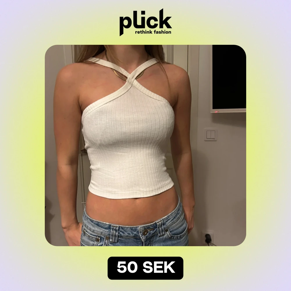 Säljer en superfin vit halterneck topp från Ginatricot. Den är ärmlös och har en snygg omlott-design framtill.