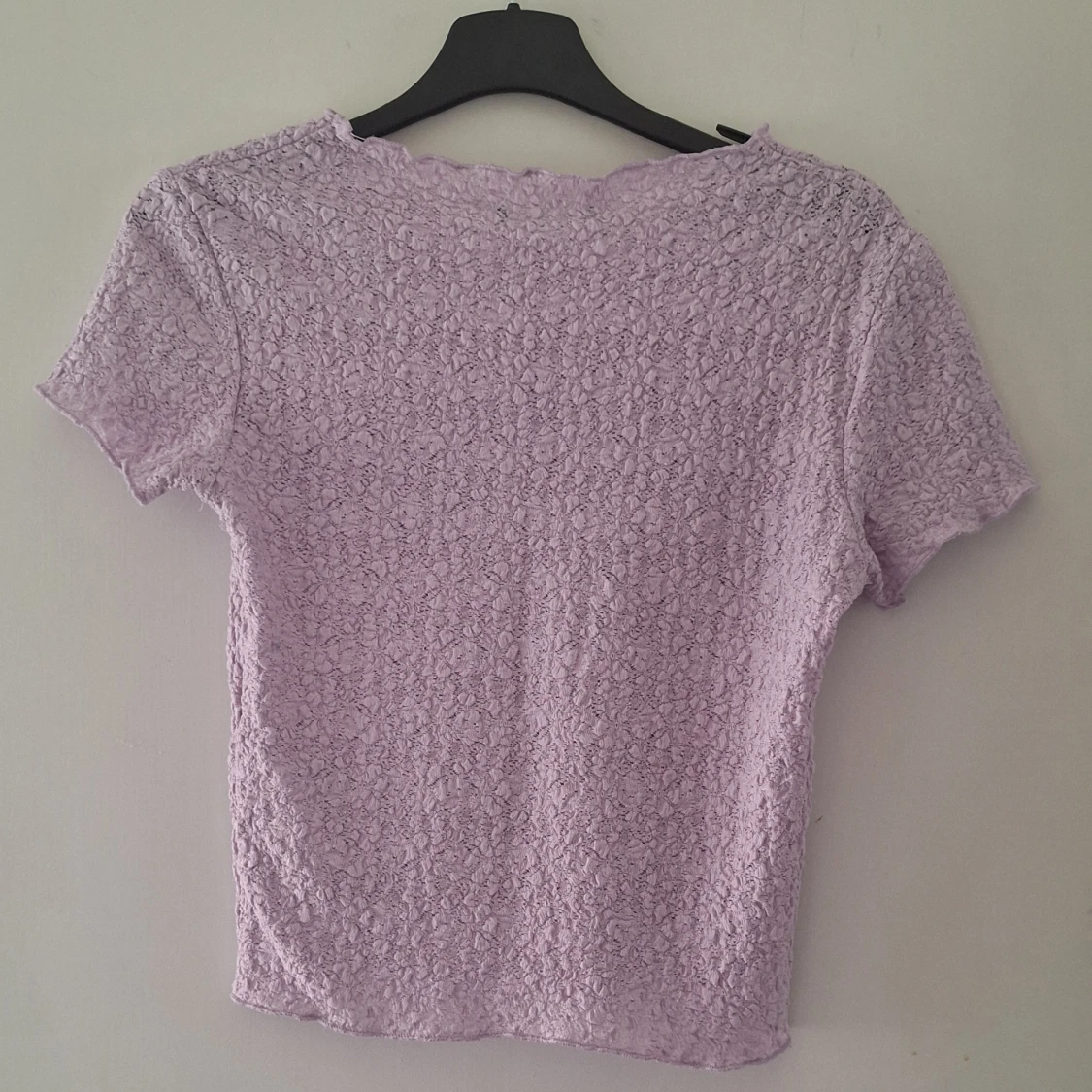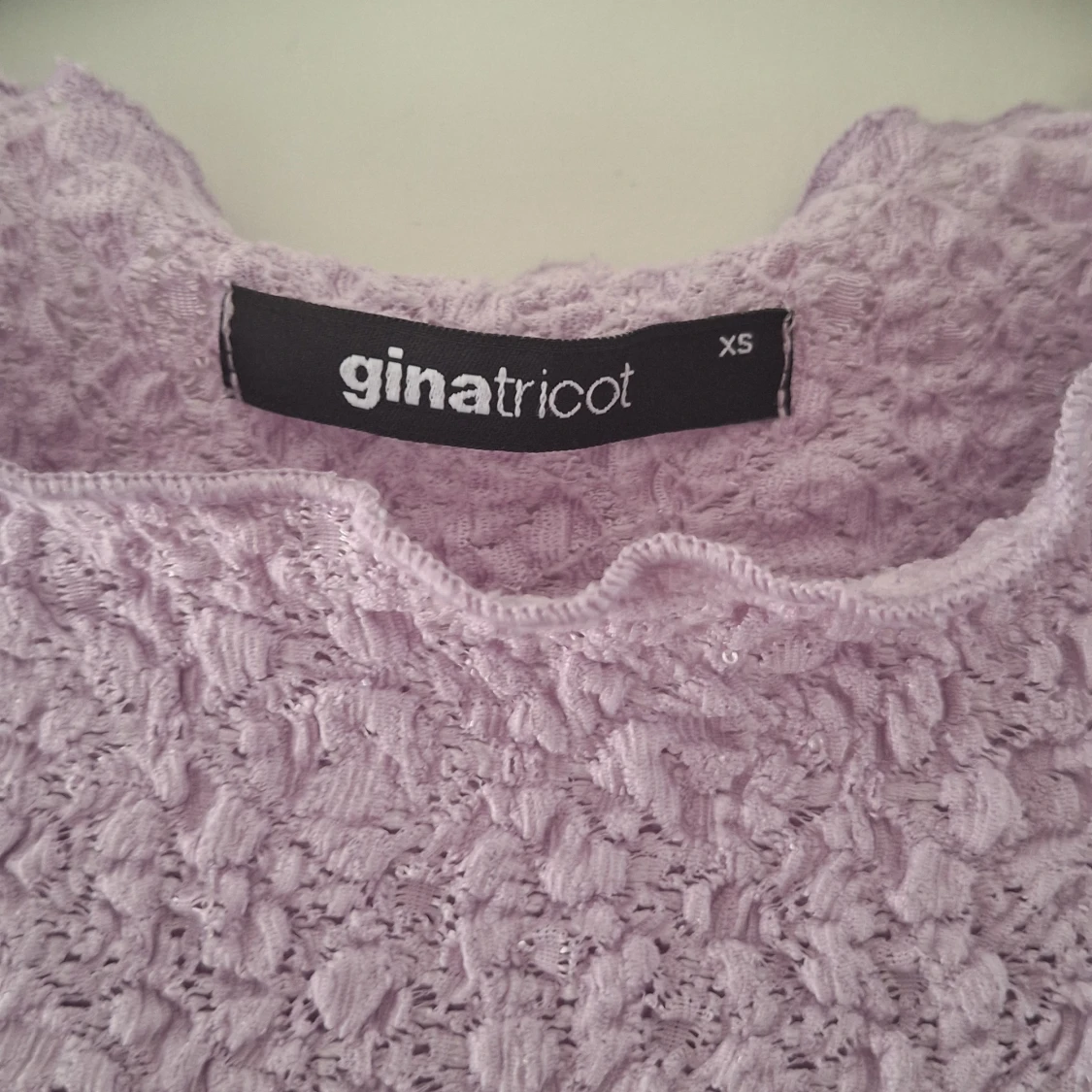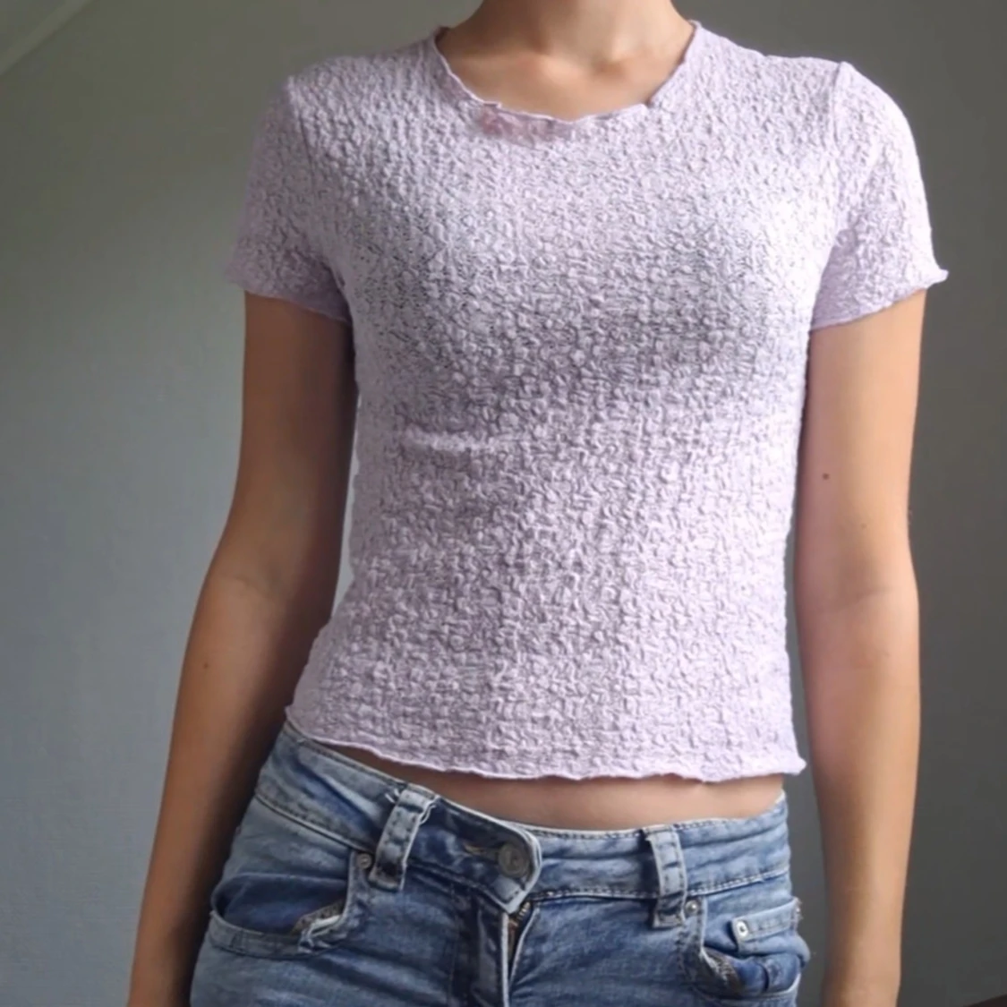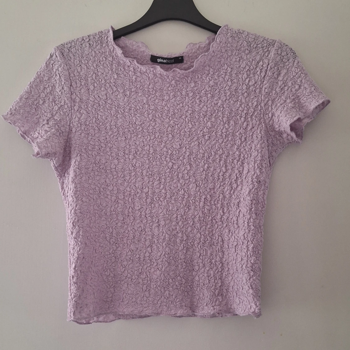Supersöt ljuslila topp från Gina Tricot i storlek XS. Den har korta ärmar, ribbad och krusig struktur samt en lätt vågig kant vid halsen och lite genomskinlig.