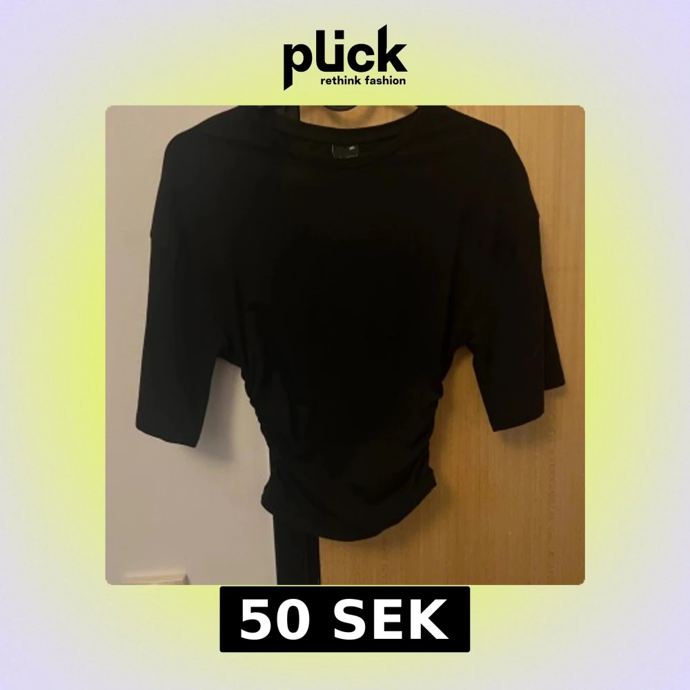 Svart topp med halvlånga ärmar och rynkade sidor som ger en snygg siluett. Enkel och stilren design, perfekt att matcha med jeans eller kjol. Mjuk och stretchig känsla.