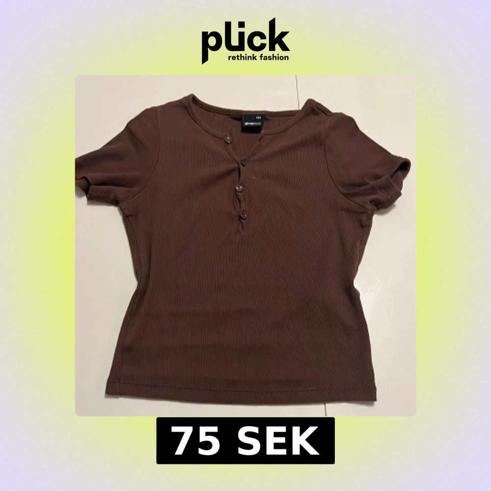 Brun ribbad topp från Gina Tricot i storlek XXS. Modellen har korta ärmar, rund halsringning och knappar framtill. Toppens material är stretchigt och sitter snyggt på kroppen. Perfekt för en chill och stilren look.
