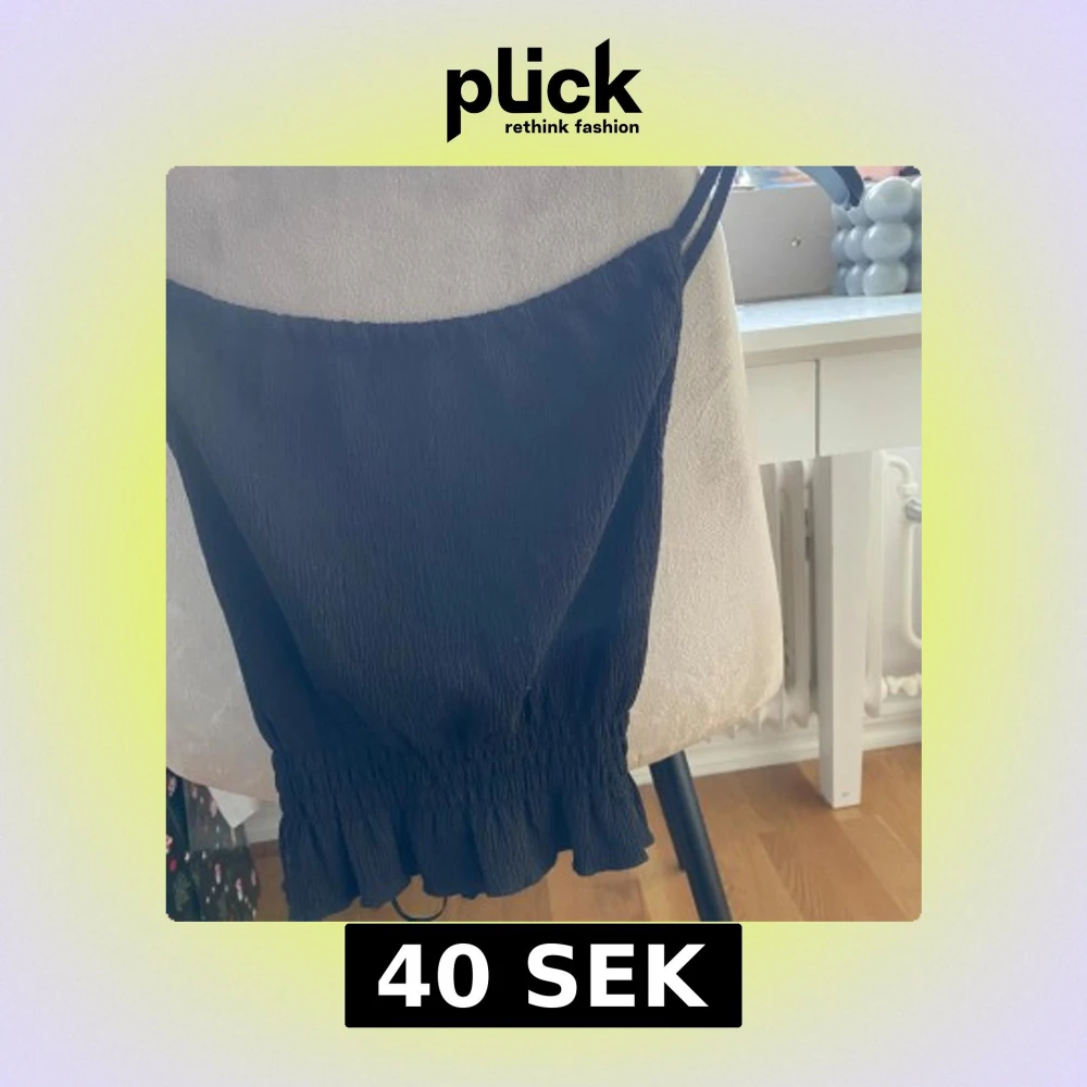 Snygg svart topp med smala axelband och volangdetalj i nederkant. Perfekt för en stilren look. Skicka gärna prisförslag