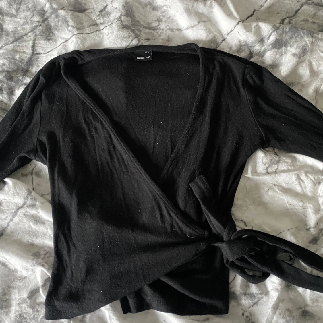 Svart topp från Gina Tricot. Toppen har långa ärmar, djup v-ringning och knytband i midjan! 🤍 den kommer tyvärr inte till användning men skriv vid fler bilder och prisdiskutering 💋