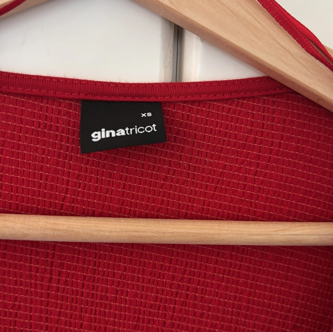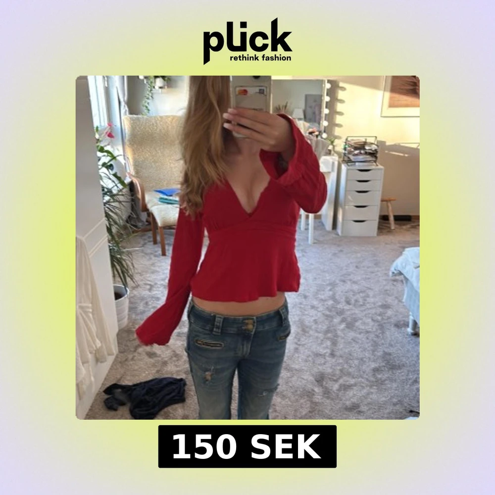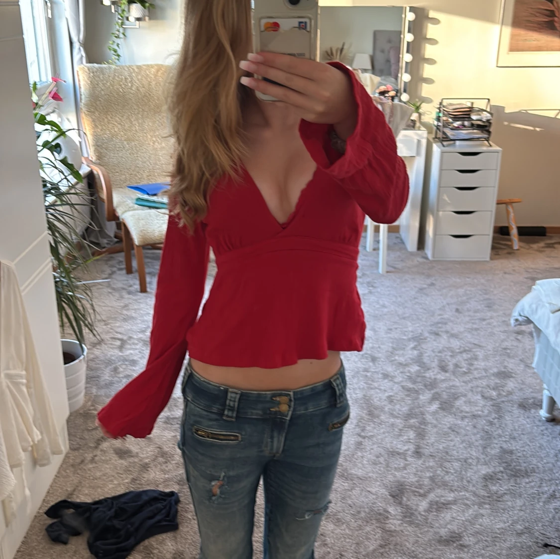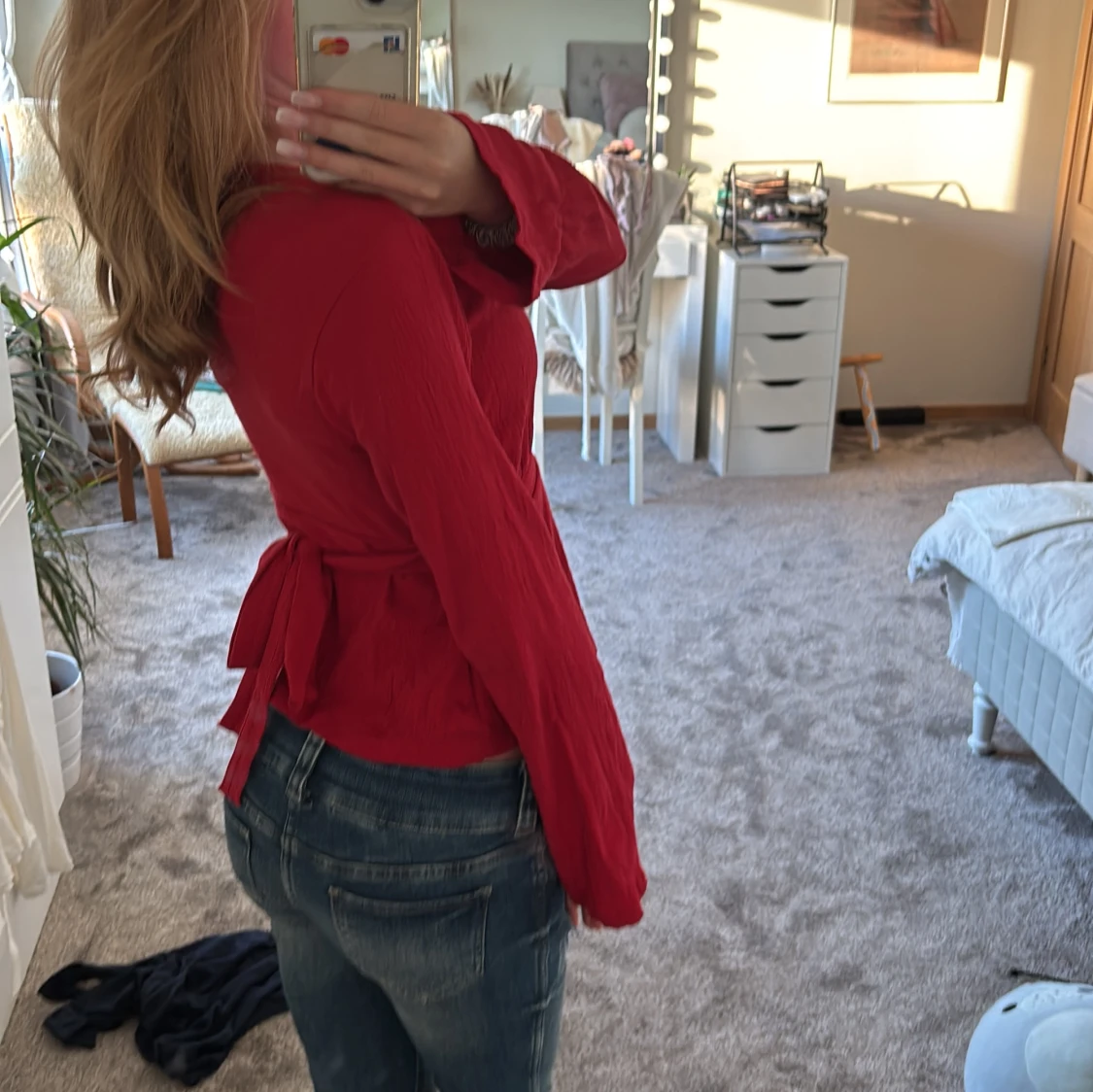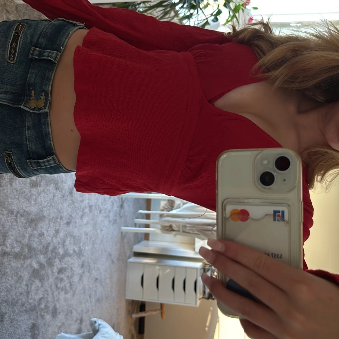 Säljer en röd omlottopp med djup v-ringning och långa ärmar. Toppen har knytband i midjan och är tillverkad i ett lätt, strukturerat tyg som ger en snygg passform. Skulle säga att denna har krympt lite i tvätten som gör att den även kommer passa XSS. Såg precis det lilla hålet vid v-ringningen men absolut inget man märker. Pris kan diskuteras isåfall 💗