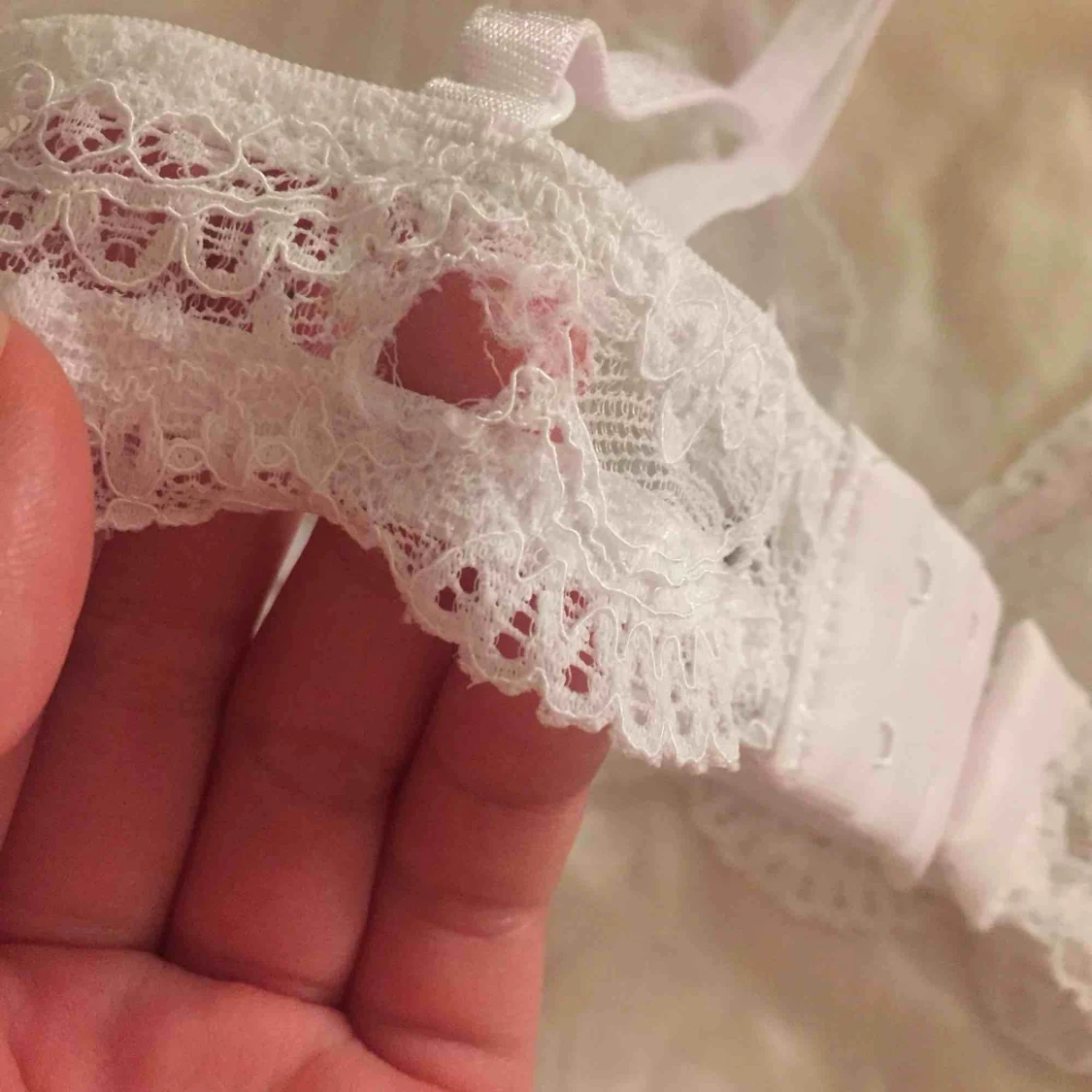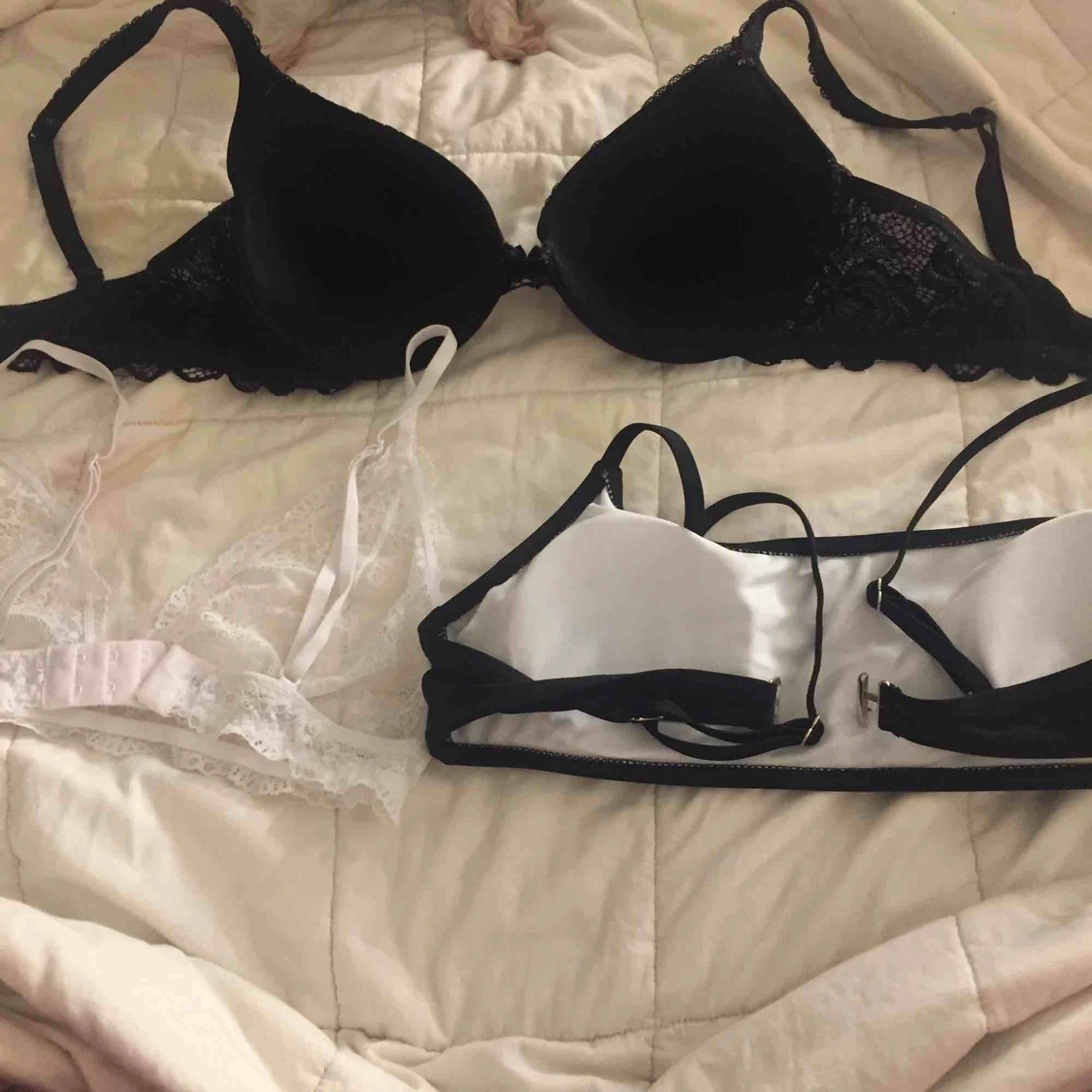 En svart vadderad bh med padding inte push upp i storlek 75D från trofé och en vit spets bralette från gina tricot i storlek M.