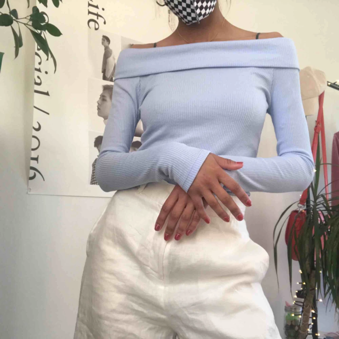 Ribbstickad off-shoulder ljusblå topp från Gina Tricot. Aldrig använd!!