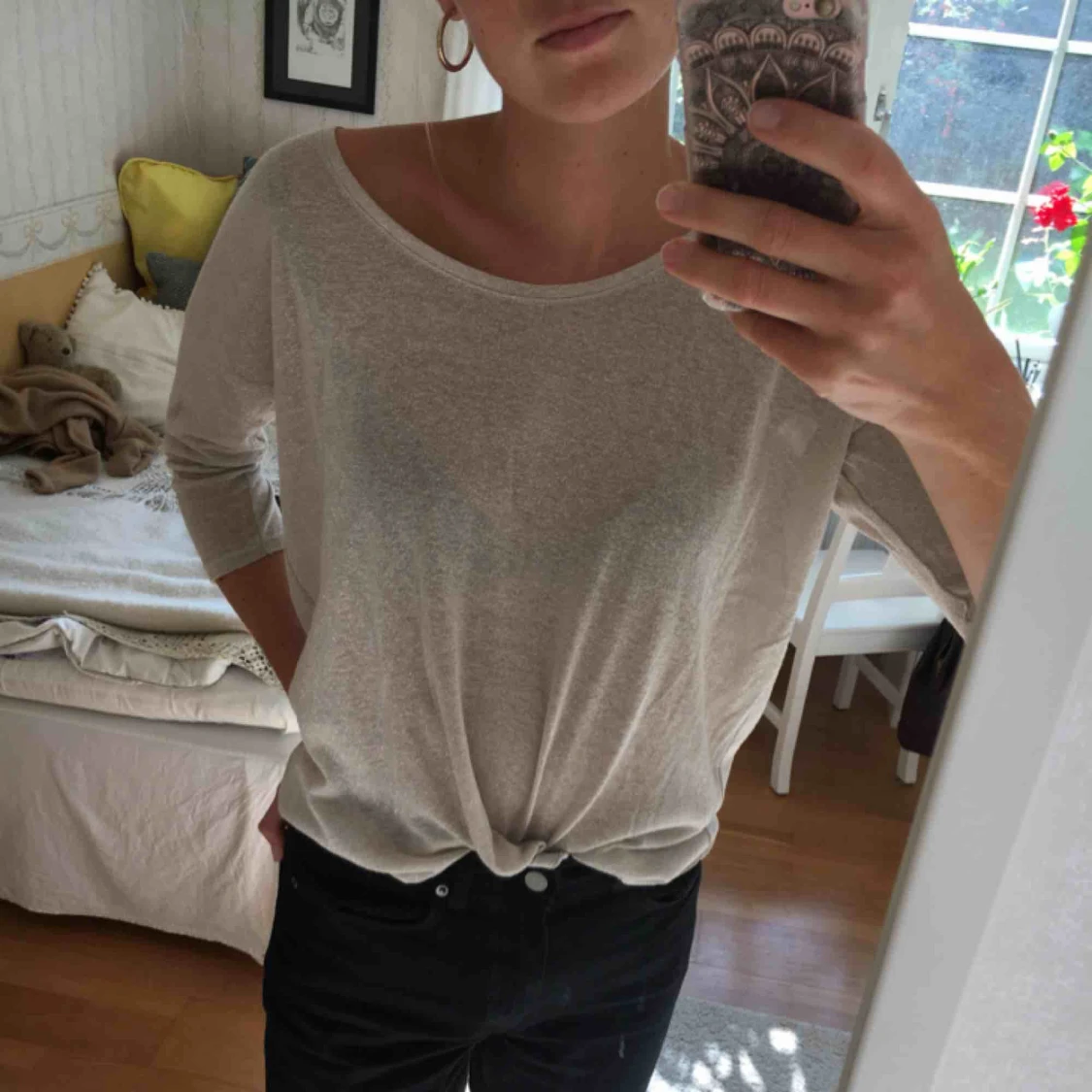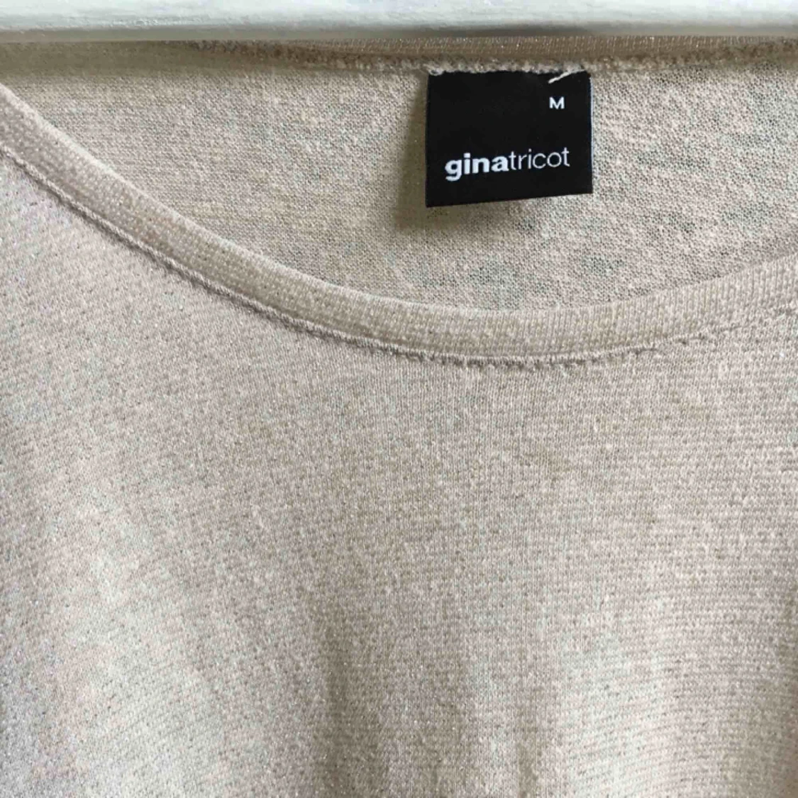 En diskret glittrig top i beige färg från Gina Tricot, storlek M. Den är använd några gånger, men fortfarande i gott skick! Du betalar själv för frakten, eller alternativt kan jag mötas upp i Lund :)