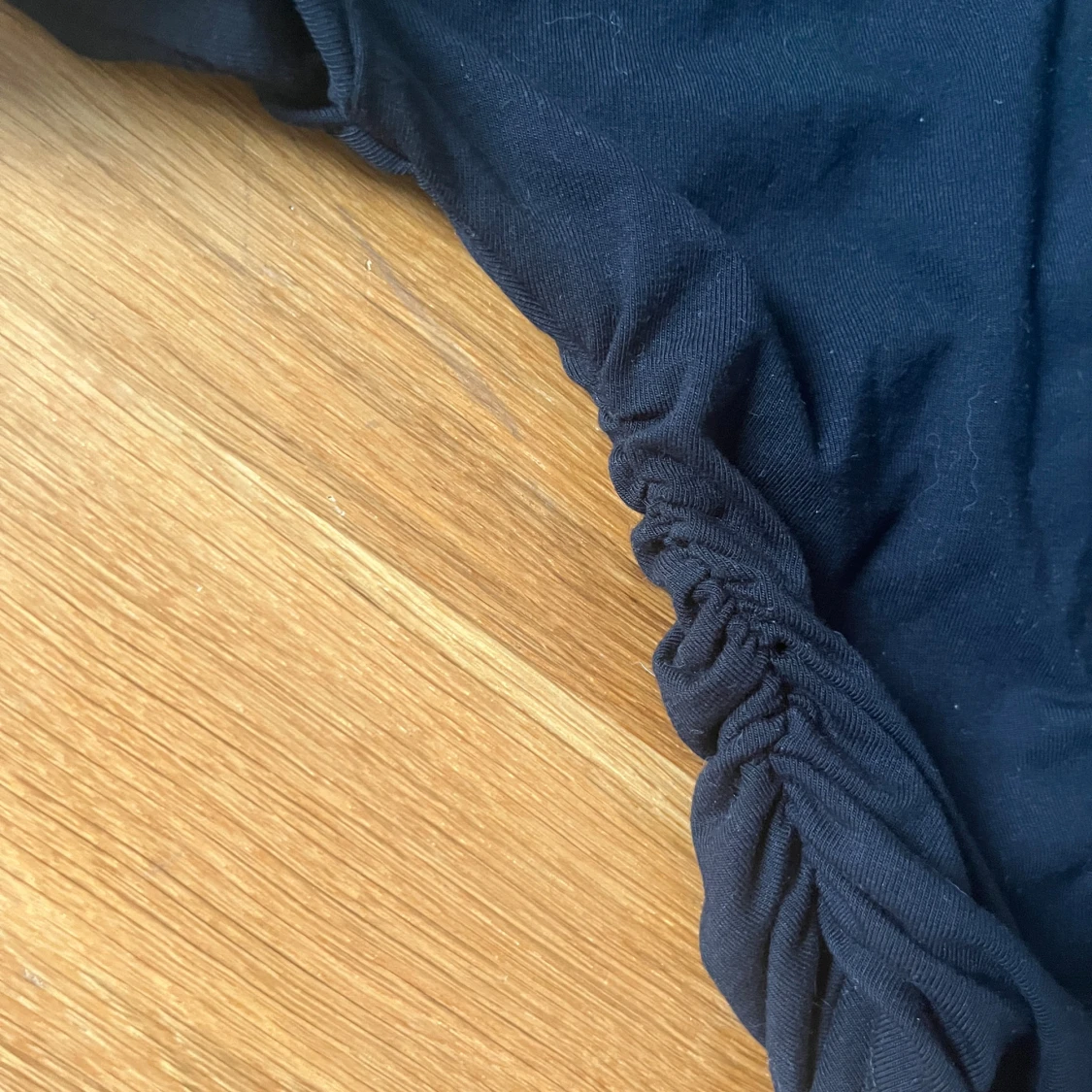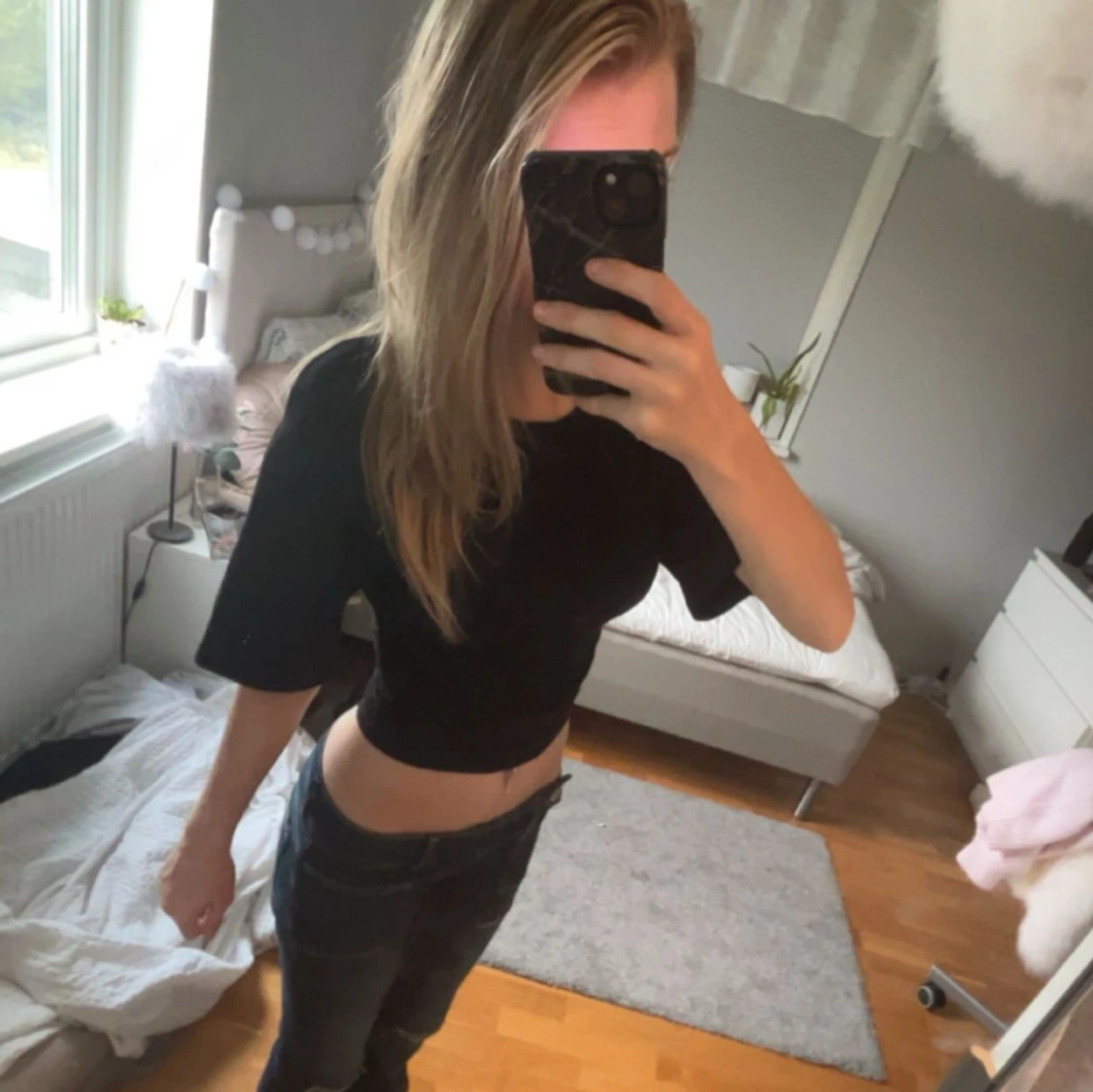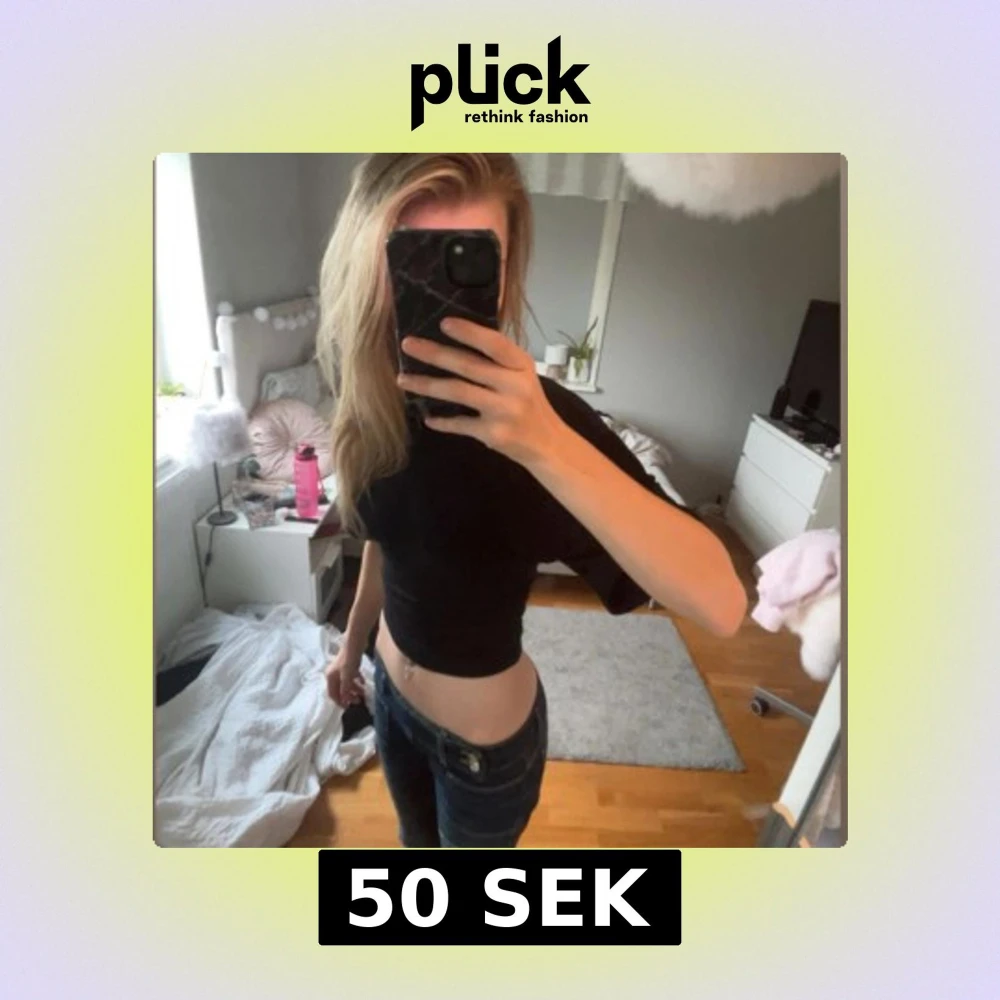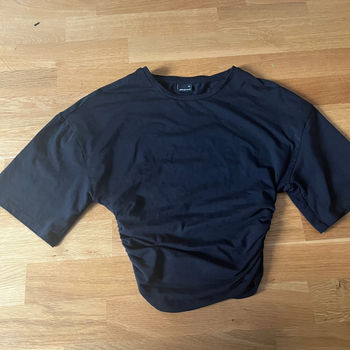 Svarta tröja som är ihopdragen vid magen/ scrunchad vis kanterna (se sista bild) Den är i storlek xs och använd 2 gånger💕