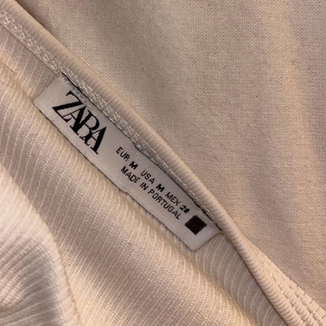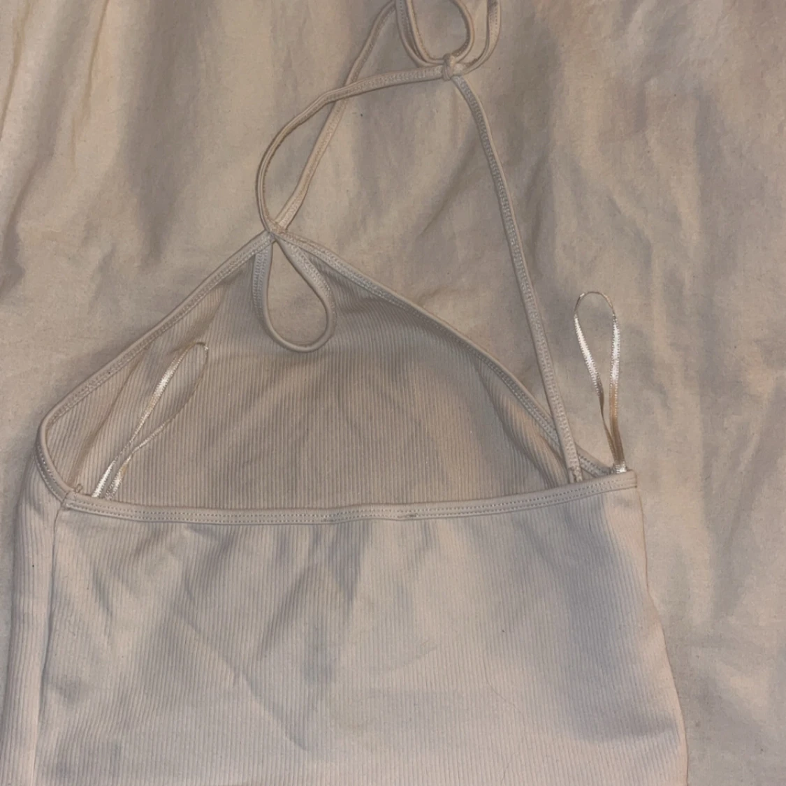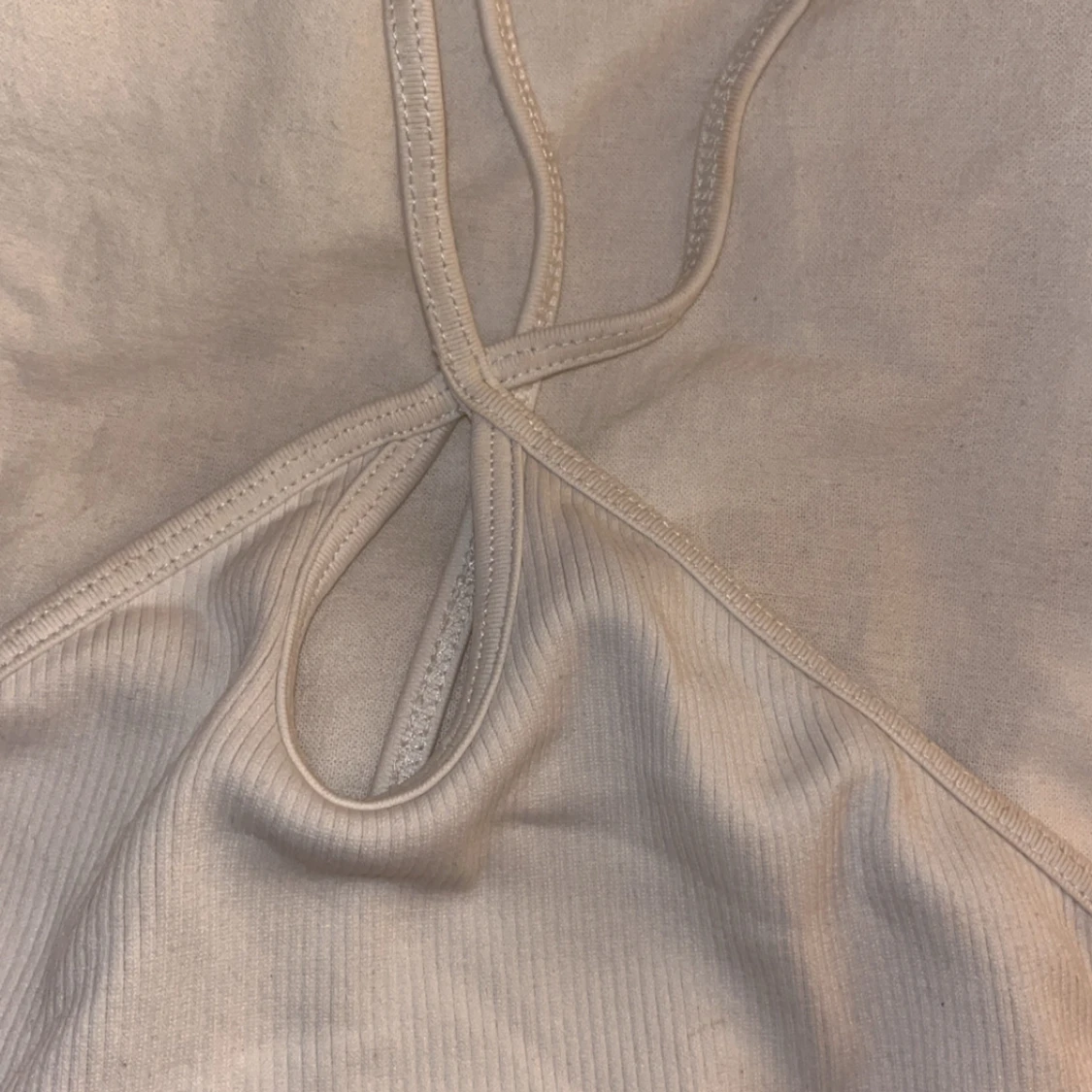 Säljer en stilren vit ribbad halterneck topp från Zara. Toppen har en enkel design med smala band som knyts i nacken. Perfekt för varma dagar eller som en del av en lager-på-lager look.