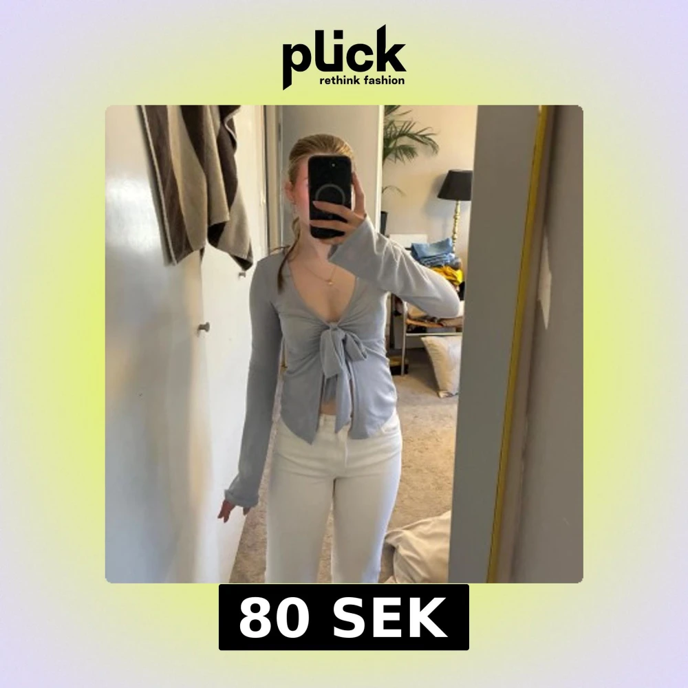 Trendig ljusgrå omlottopp med långa ärmar och knyt framtill. Djup v-ringning och figurnära passform, perfekt för att skapa en snygg siluett. Tunn och mjuk kvalitet, passar bra till både jeans och kjol.