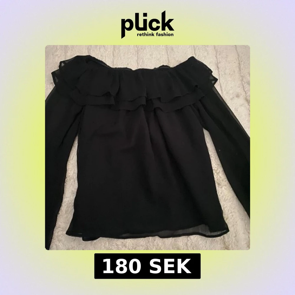 Säljer en svart offshoulder blus med långa ärmar och dubbla volanger upptill. Tunn och luftig, med genomskinligt material i armarna. Jätte snygg och festlig topp. Storlek 158/164 så passar som en xs. Säljer då den tyvärr inte kommer till användning.