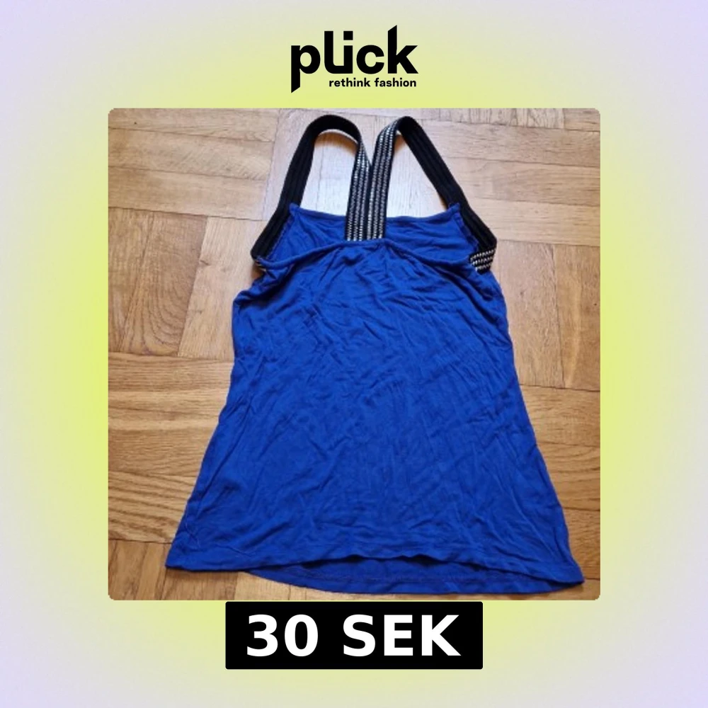 Blålila top "Mindi" från Gina Tricot med rak skärning fram och svarta axelband som glimmar i silver. Tillverkad i mjuk viskosblandning med elastan för extra stretch. Skön och i mycket bra skick! Katt i hemmet.