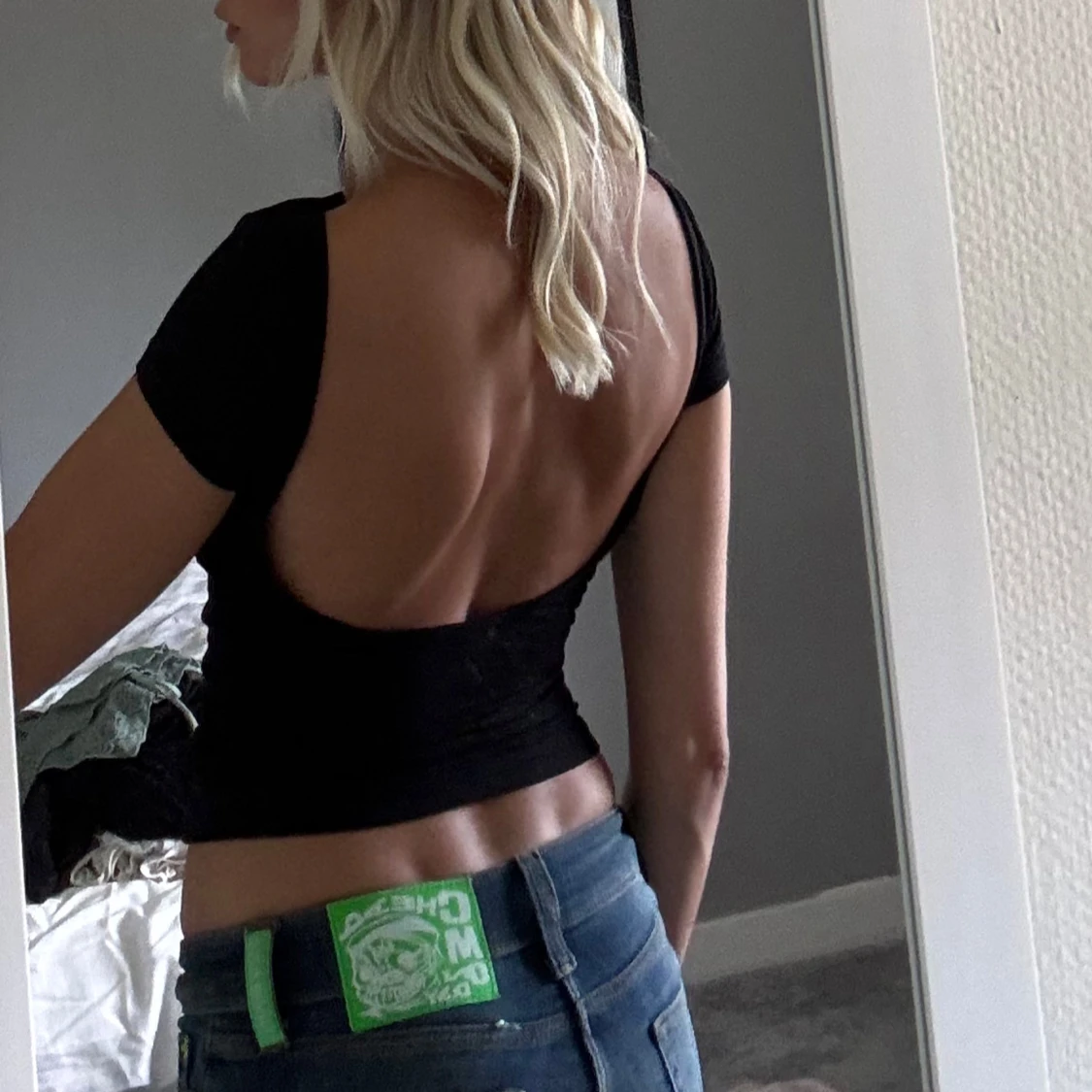 Säljer en svart croppad topp med korta ärmar och öppen rygg🖤