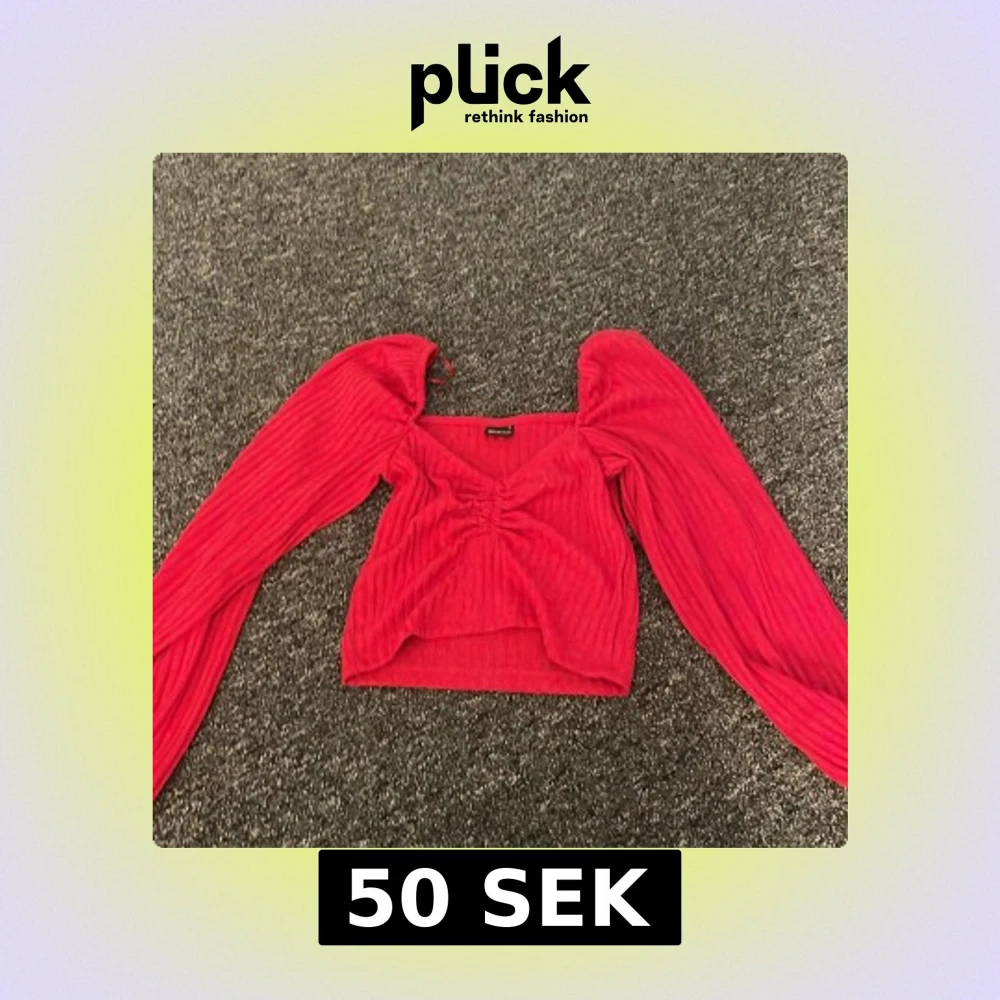 Trendig röd topp med puffiga långärmar och ribbad struktur. Toppen har en snygg rynkad detalj framtill som ger en unik look. Perfekt för att sticka ut i mängden!
