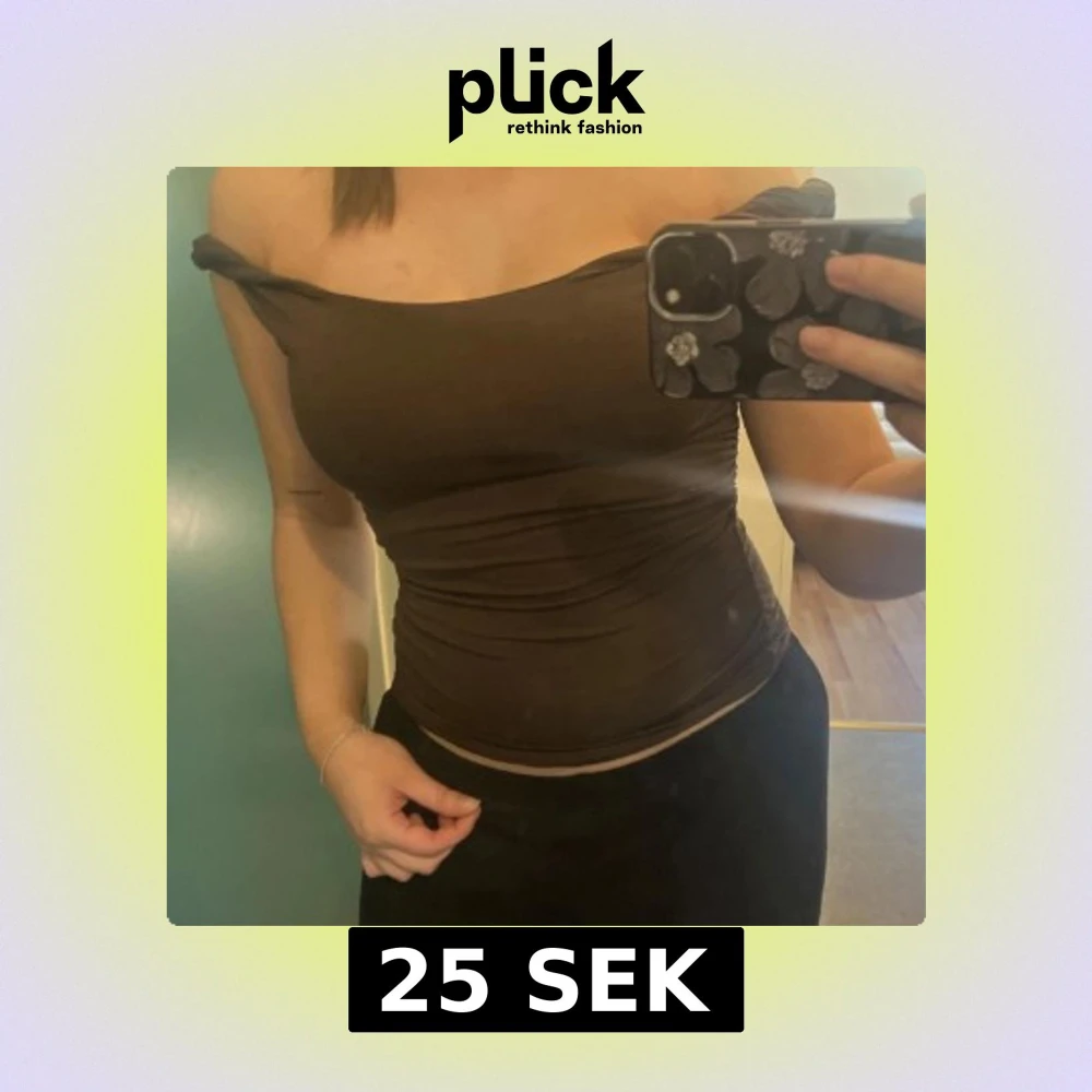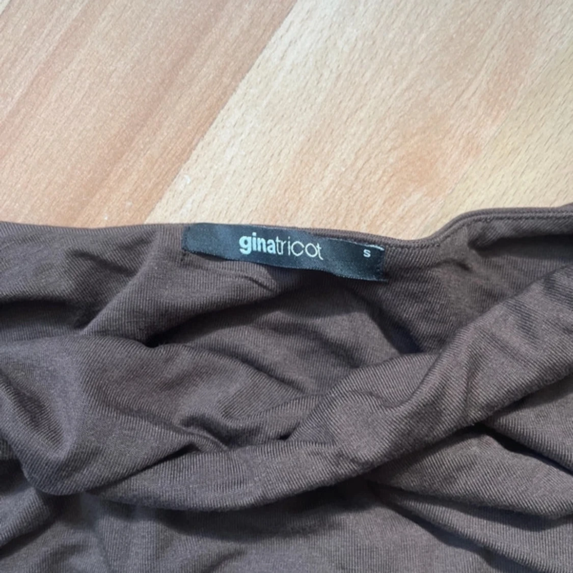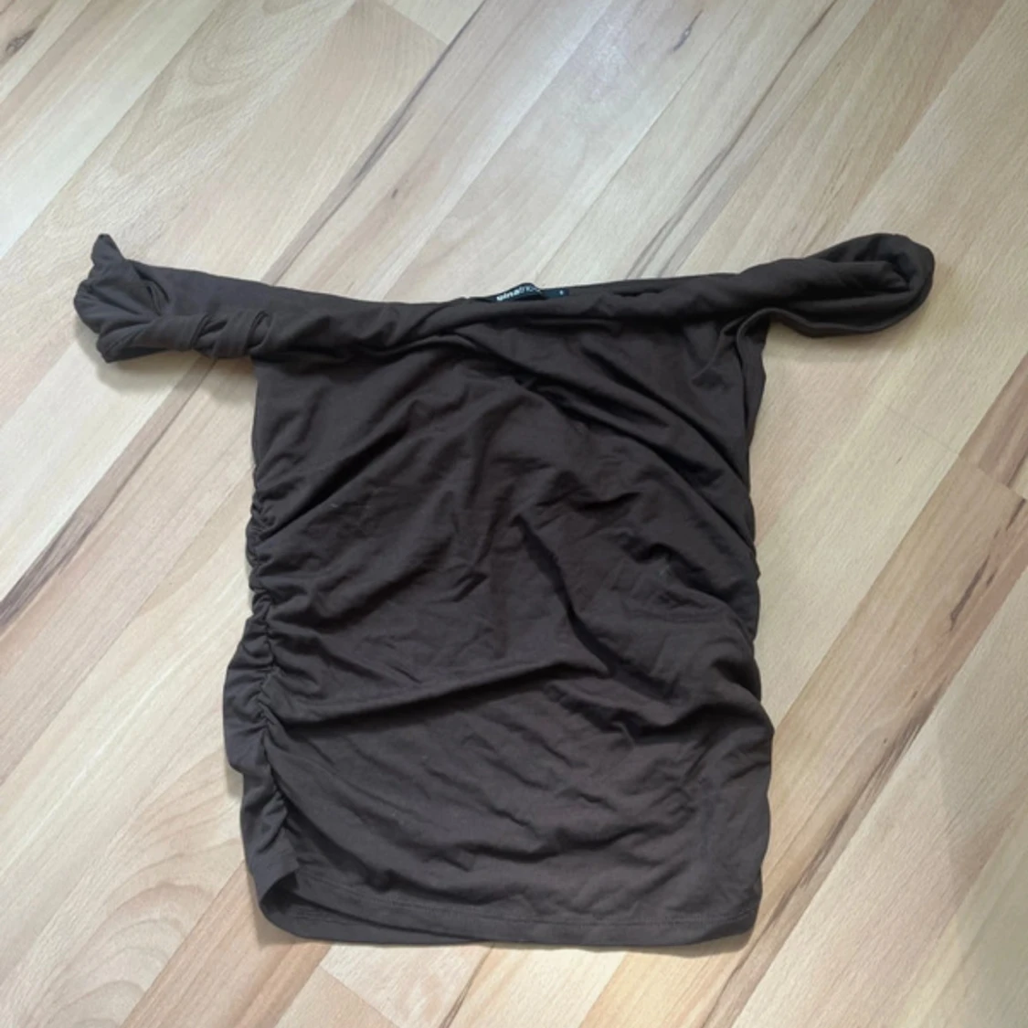Säljer en brun, tight offshoulder top från Gina Tricot. Den har rynkade detaljer på ena sidan och är tillverkad i mjukt stretchigt material. Perfekt för dig som vill ha en trendig och stilren look.
