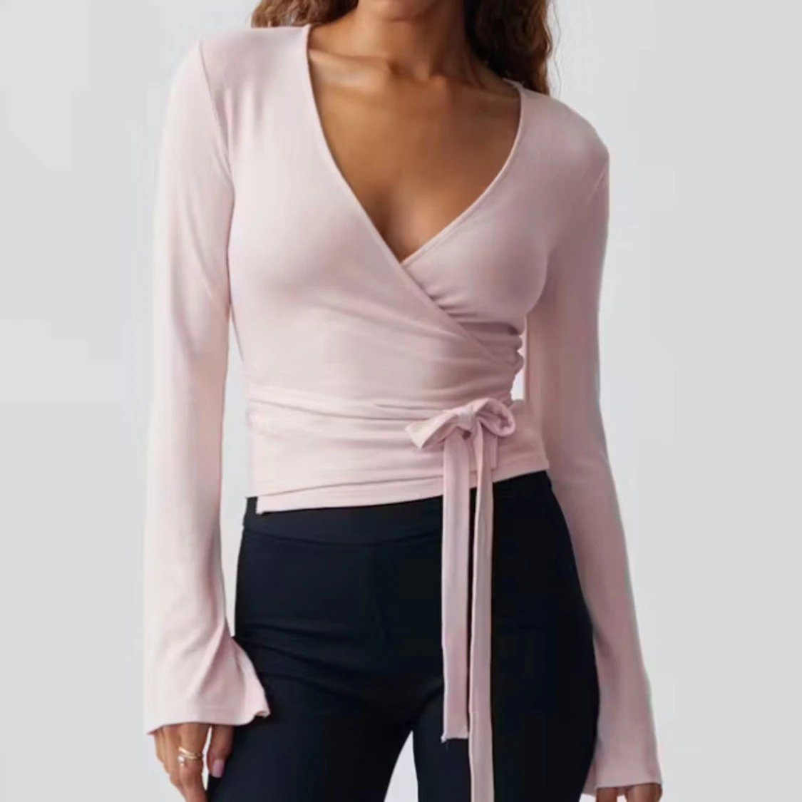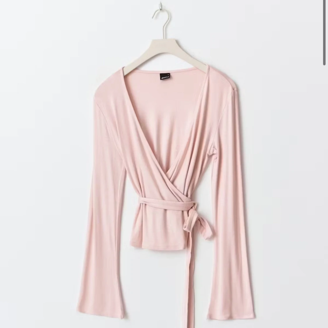 Supersöt ljusrosa omlottopp från Gina Tricot med långa ärmar och knytband i midjan. Toppens v-ringning och mjuka material ger en snygg look, skriv gärna för frågor!!❤️❤️