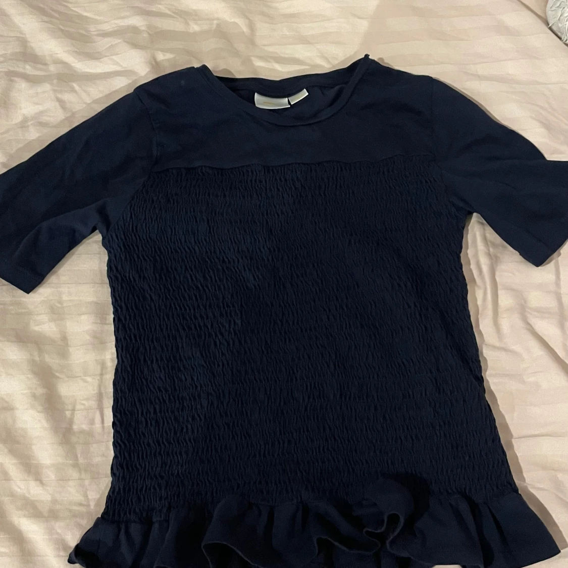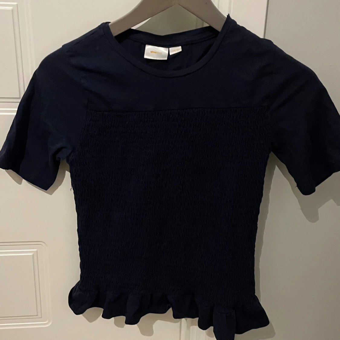 Säljer en mörkblå topp från Gina Tricot med korta ärmar och en smockad design framtill. Toppen har en söt volangdetalj vid nederkanten. Perfekt för en stilren look! Den är endast använd en gång. Pris går att diskutera.