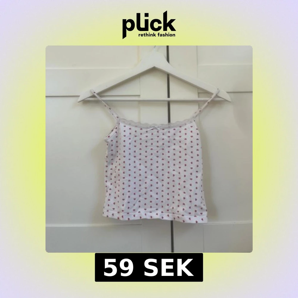 Supersöt vit linnetopp med små röda hjärtan över hela tyget. Spaghettiband och spetskant upptill ger en gullig vibe. Perfekt för varma dagar eller som layering-piece. Tunt och mjukt bomullsmaterial.