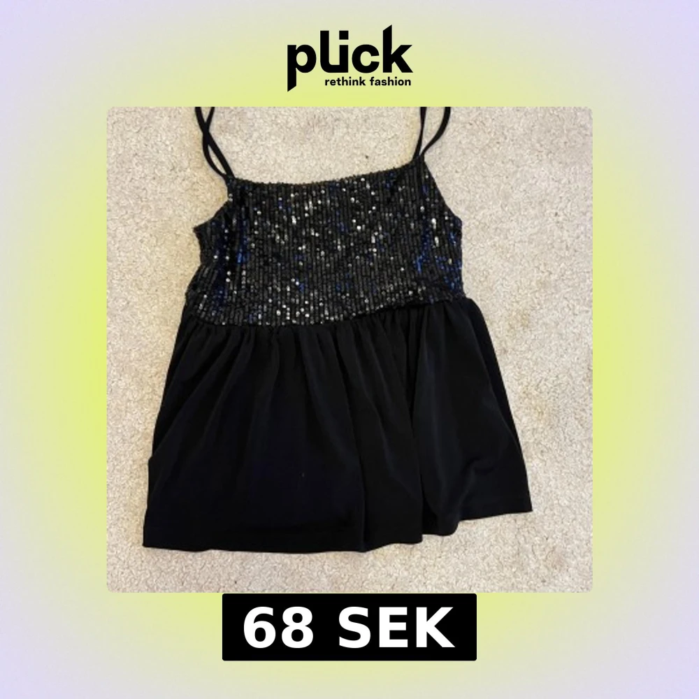 Supersnygg svart linne-topp med tunna axelband och glittrig paljettöverdel. Toppen har en flowy, luftig nederdel och passar perfekt när du vill sticka ut. Paljetterna är i svart och silver med inslag av blått för extra effekt.