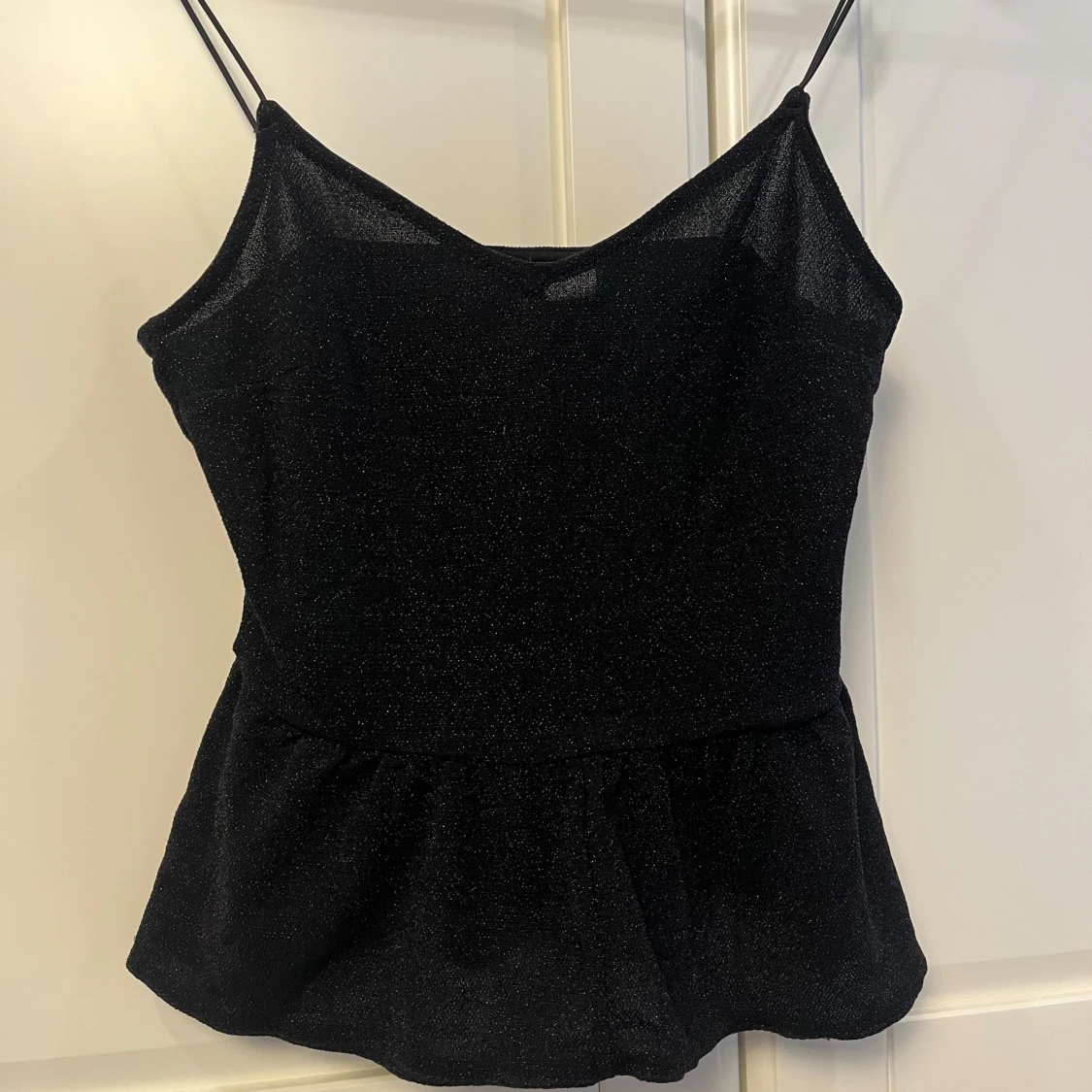Snygg svart glittrig linne med smala axelband och en lätt utsvängd nederdel. Perfekt för en kväll ute eller en festlig tillställning. Enkel men elegant design som passar till många olika outfits.