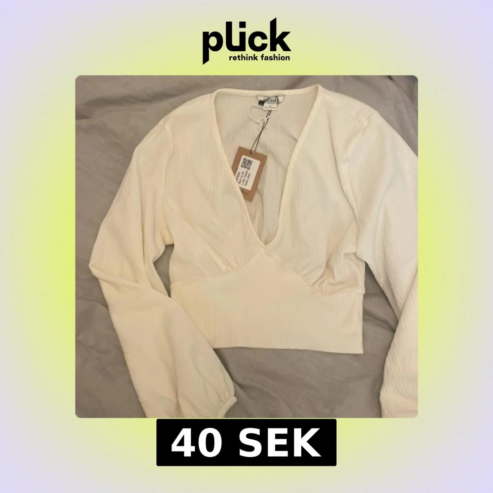Säljer en stilren beige/krämvit blus från Monki med djup v-ringning och långa ärmar. Toppen har en markerad midja och är tillverkad i ett lätt, strukturerat material. Perfekt för att skapa en trendig look. fläckar på baksidan av ärmen men syns inte så mycket (bild 2)