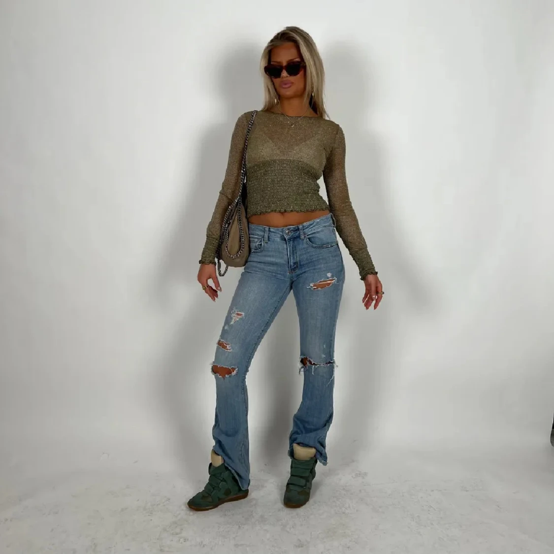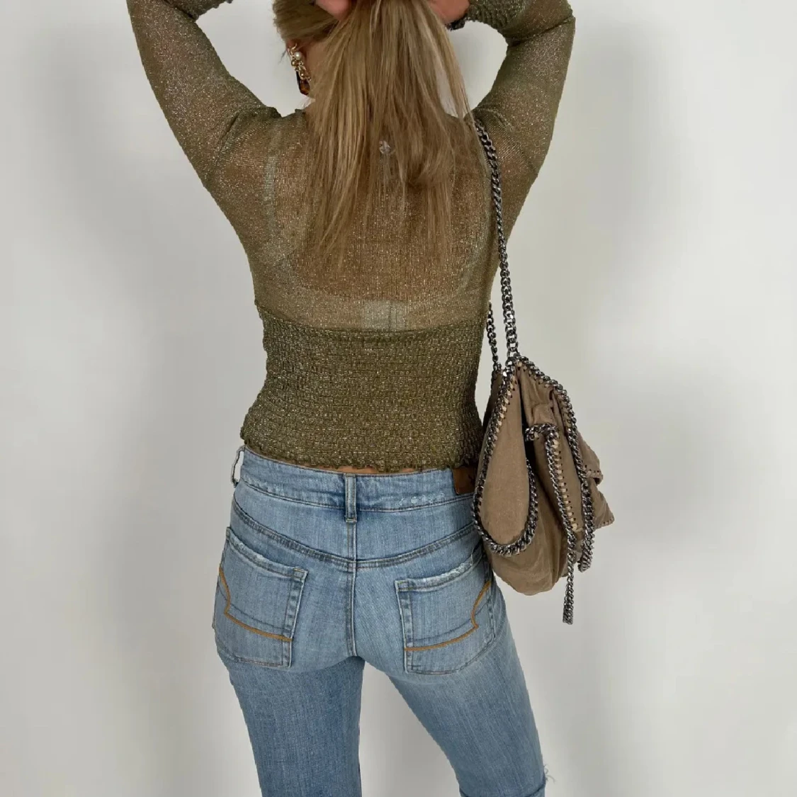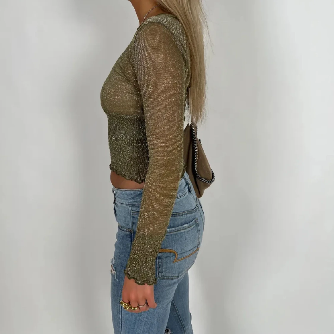 Säljer en olivgrön glittrig croppad topp med lång ärm och smockad midja. Toppen har transparenta partier och vågig kant nertill och vid ärmslut. Perfekt för dig som gillar att sticka ut med lite extra shine.
