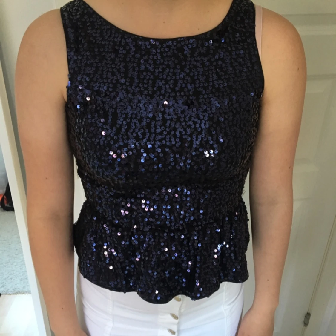 Superfin partytopp med blå/lila paljetter från bikbok. I storleken XS och använd ett fåtal gånger.