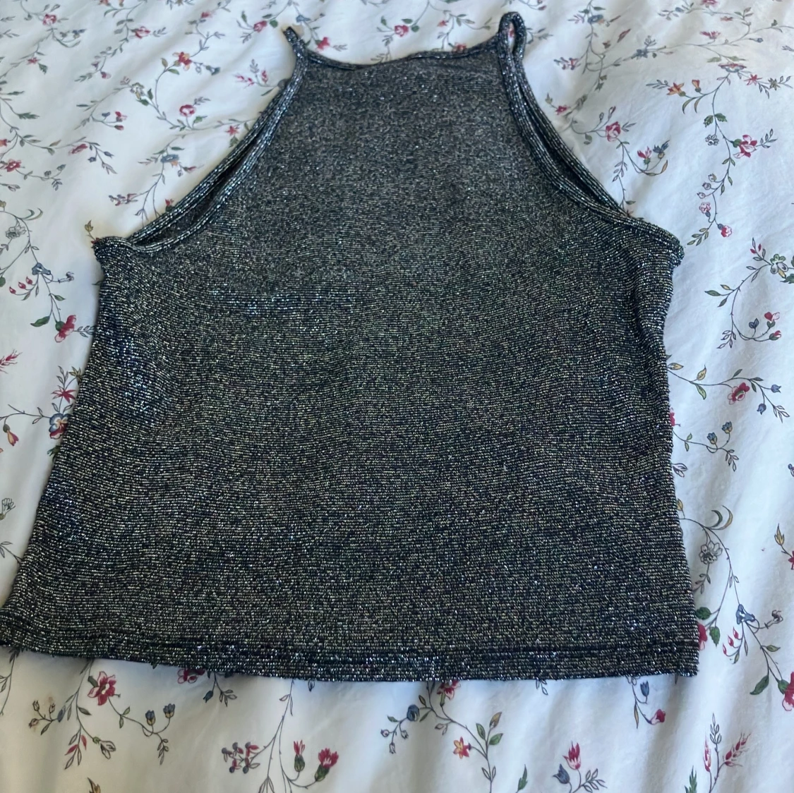 Säljer en glittrig croppad topp från H&M Divided i storlek XS. Toppen är ärmlös med hög hals och har en snygg silverfärgad finish som verkligen sticker ut. Perfekt för dig som vill ha något extra till outfiten!