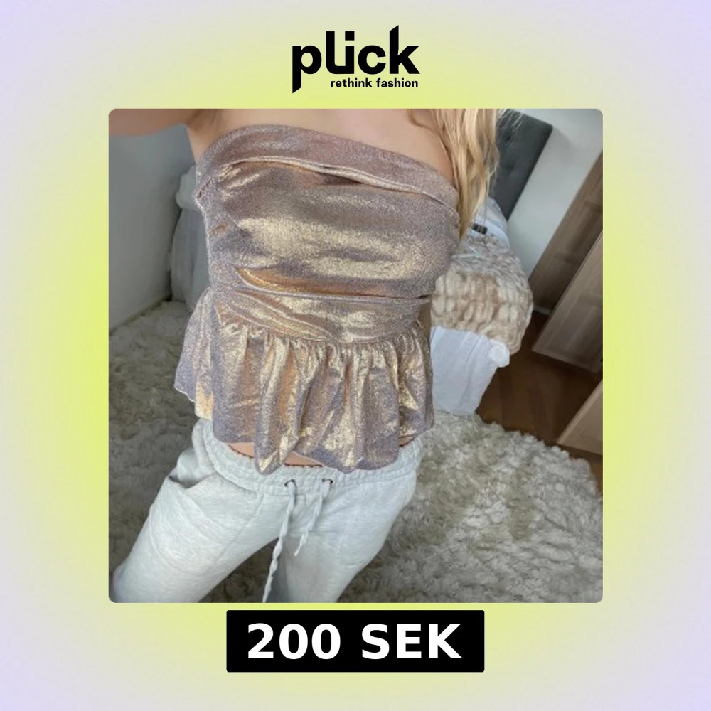 Säljer en glittrig guld tubtopp med volangdetaljer. Perfekt för en festlig look. Toppen är axelbandslös och har en glansig finish som fångar ljuset fint.