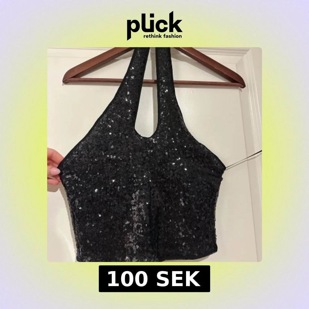Snygg glittrig halterneck topp med paljetter. Aldrig använd, endast provad. Dragkedja i ryggen. Storlek S