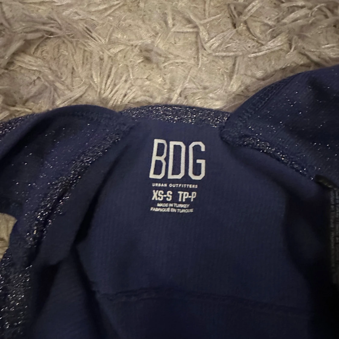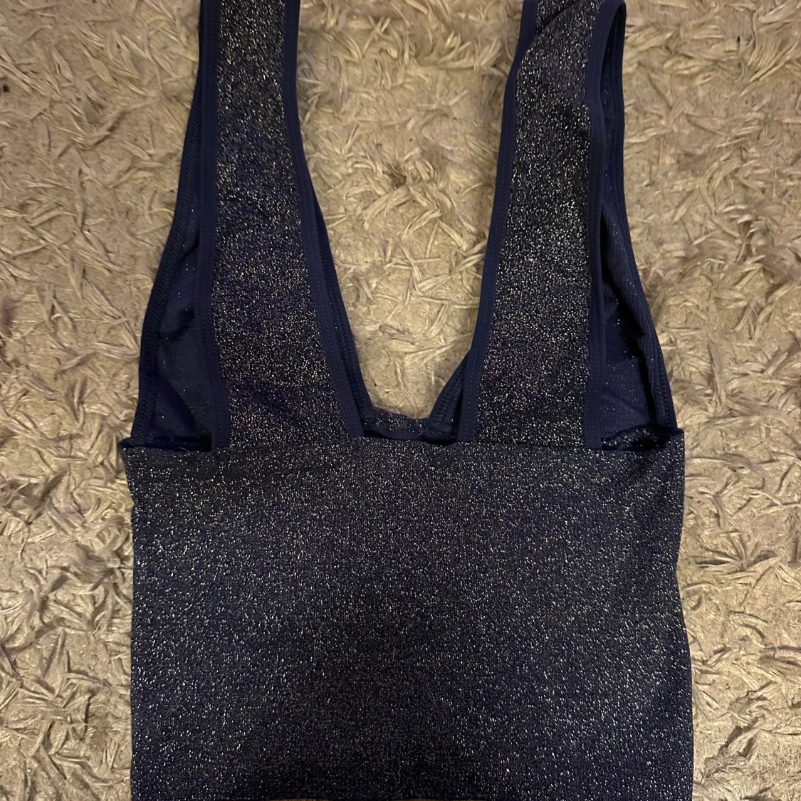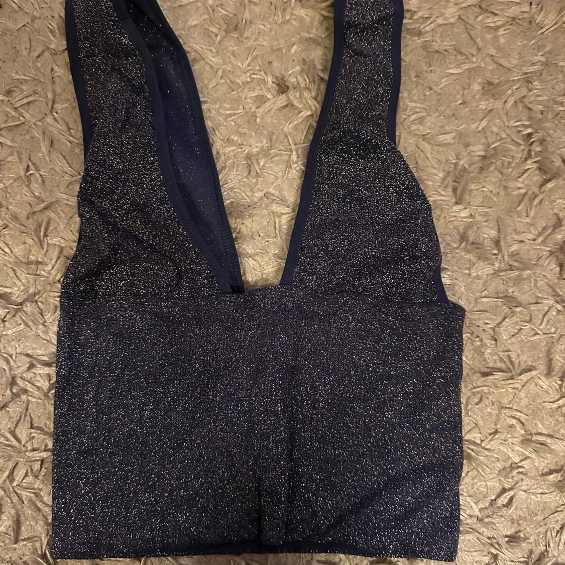 Säljer en glittrig mörkblå croppad topp från BDG Urban Outfitters. Toppen har djup v-ringning och är ärmlös med breda axelband. Perfekt för att sticka ut med sitt glittriga material och trendiga look. Pris diskuteras vid snabb affär 💕💕